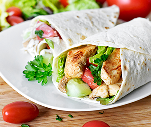 Toto je klasika, ktorá sa nikdy nepreje. Základom je hotová pšeničná tortilla, grilované kuracie mäso na kúsky, množstvo zeleniny a dip z kyslej smotany.