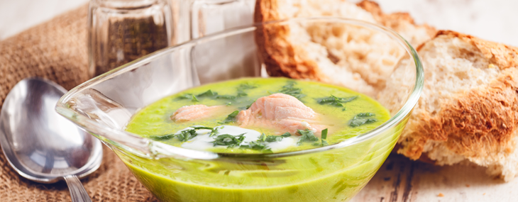 Na olivovom oleji opražíme 1 nakrájanú cibuľku. Keď zavonia, pridáme 1-2 strúčiky cesnaku. Premiešame a pridáme 1 kg mrazeného hrášku. Mrazený hrášok odporúčam kvôli krásne zelenej farbe. Zalejeme 1 l teplého zeleninového vývaru. Privedieme k varu. Následne všetko tyčovým mixérom rozmixujeme. Dochutíme soľou a korením a cez sitko precedíme. Pripravíme si smotanu s najemno pokrájaným kôprom, ktorá chuť polievky zjemní. Polievku naservírujeme a zdobíme plátkom údeného lososa, smotanou a vetvičkou kôpru.