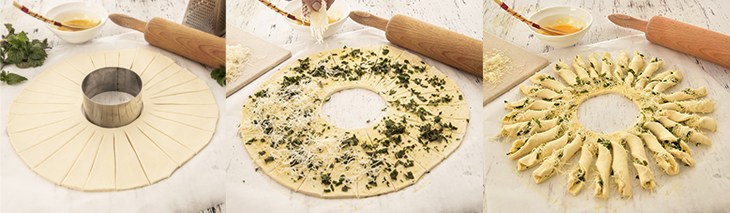 Lisové cesto rozvaľkajte do kruhu a uprostred pohárom alebo tvorítkom vykrojte koliesko. Potom stačí radielkom narezať jednotlivé lúče od vonkajšej strany k stredu, len dávajte pozor, aby ste nedokrojili. Nasekané žihľavy a syr rozprestrite po celej ploche cesta. Prúžky stačí 2x alebo 3x pretočiť, pomazať mašlovačkou rozmiešaným žĺtkom a dať na 15 minút piecť na 180 °C do rozohriatej rúry.