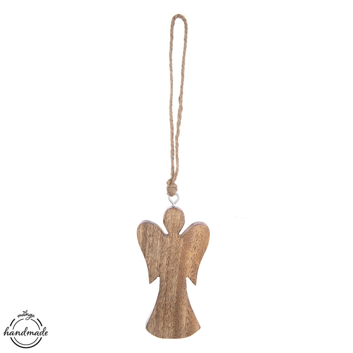 Kód produktu 351873Dekorácia ANJEL na zavesenie ozdobí vašu domácnosť nielen v období Vianoc, využiť ju môžete po celý rok. Vhodná tiež ako darček. Materiál: mangové drevo, kov, juta. Rozmery: š. 8,2 cm, v. 14,7 cm, v. s povrazom 35 cm.