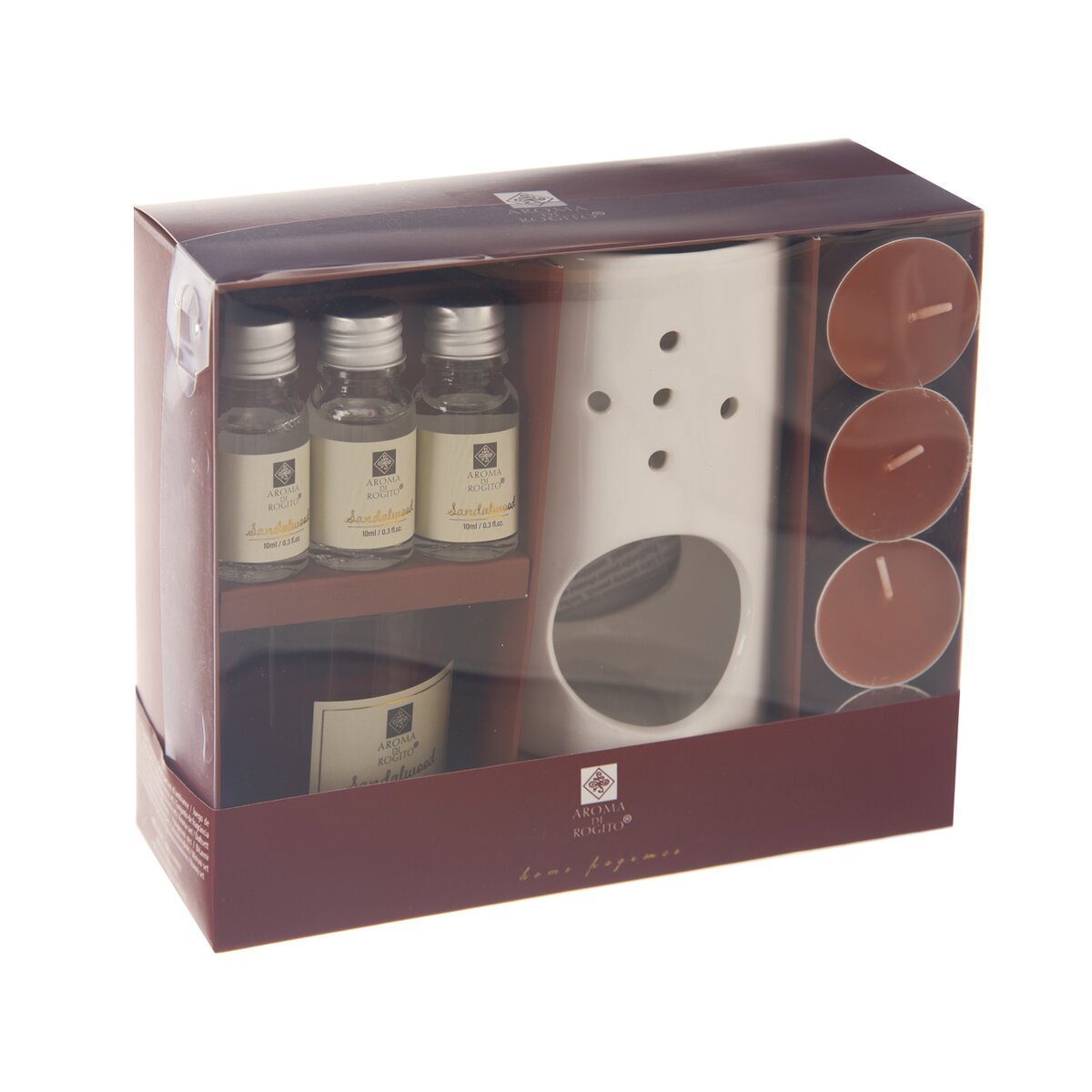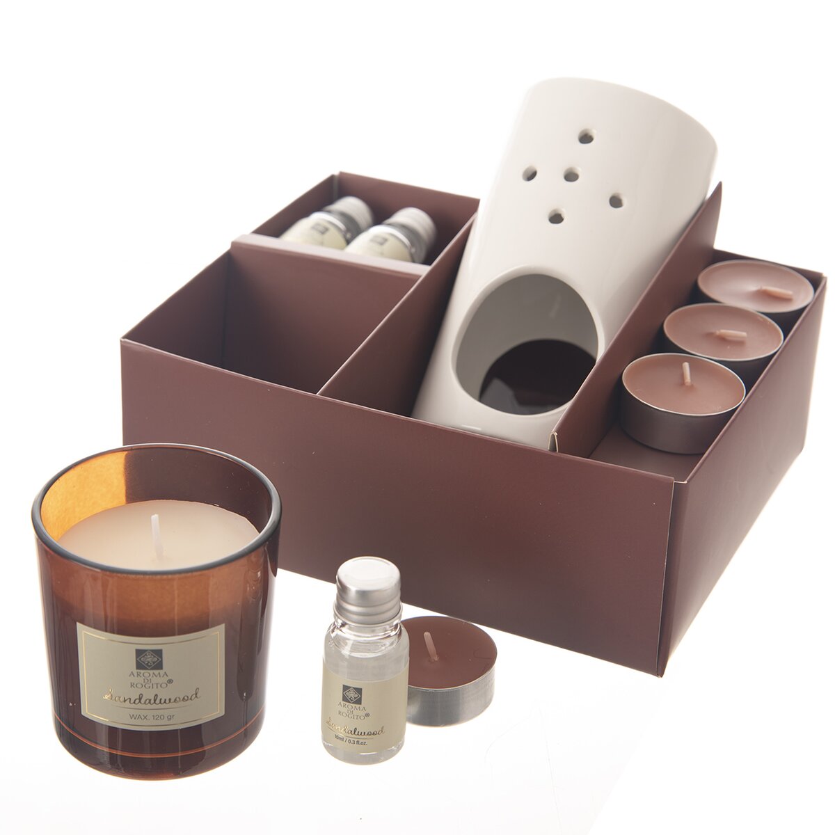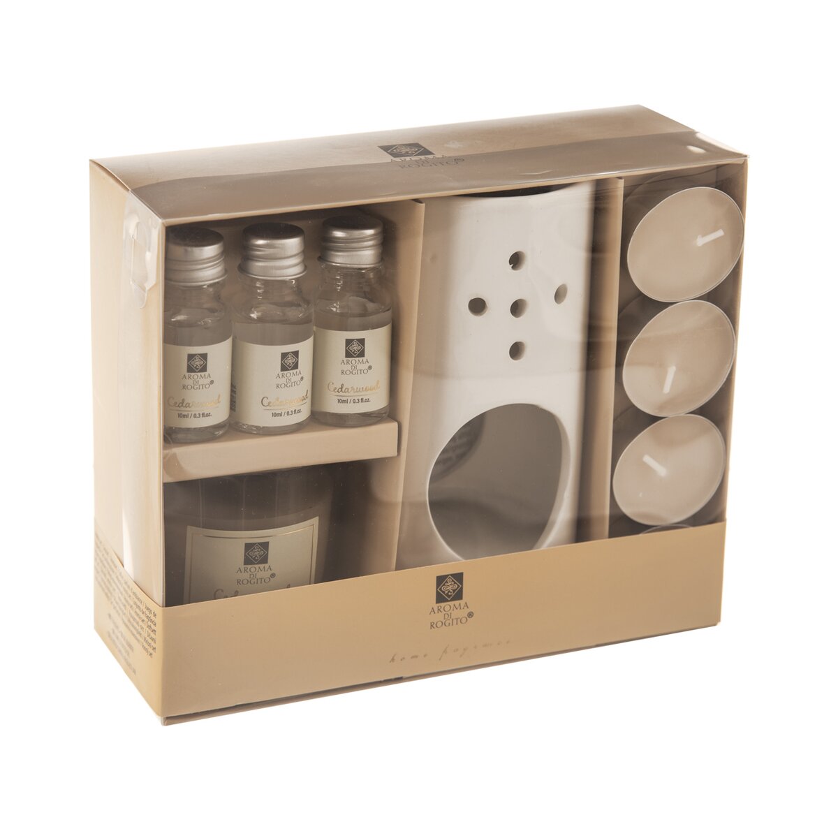 Kód produktu 822257Darčeková sada s keramickou aromalampou, 3 aróma olejmi, 1 vonnou dekoratívnou sviečkou a 4 vonnými čajovými sviečkami do aromalampy. Mix 3 vôní - cédrové drevo, santalové drevo a pačulové drevo.