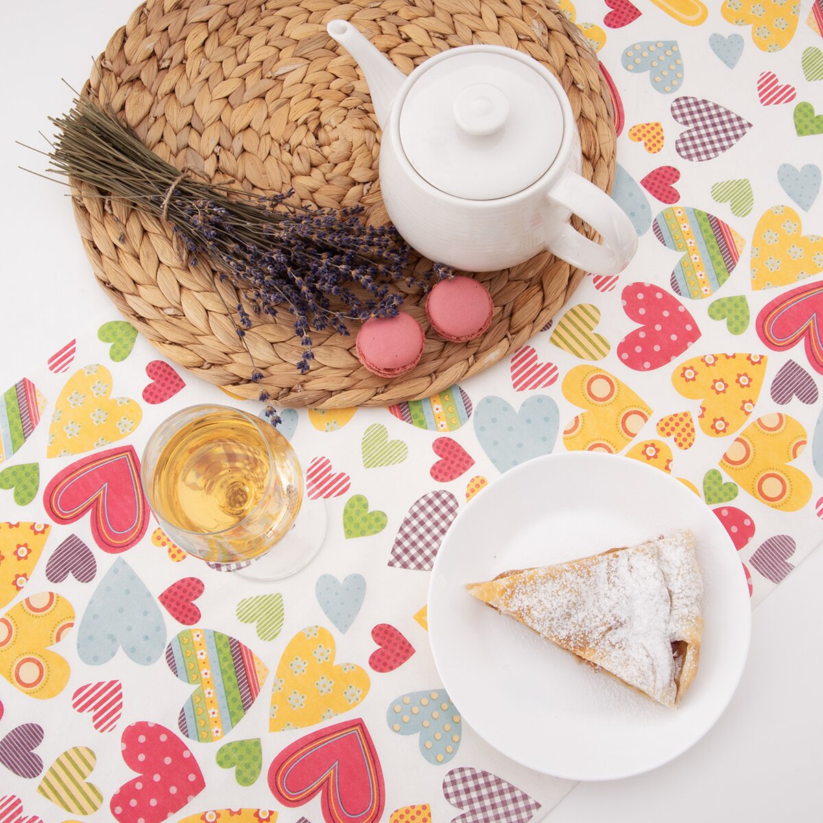 Kód produktu 728086Papierový behúň v rozmere 180x40 cm zdobí dekor farebných srdiečok a vytvorí základ pre pekne prestretý stôl doma, na terase aj na záhrade.