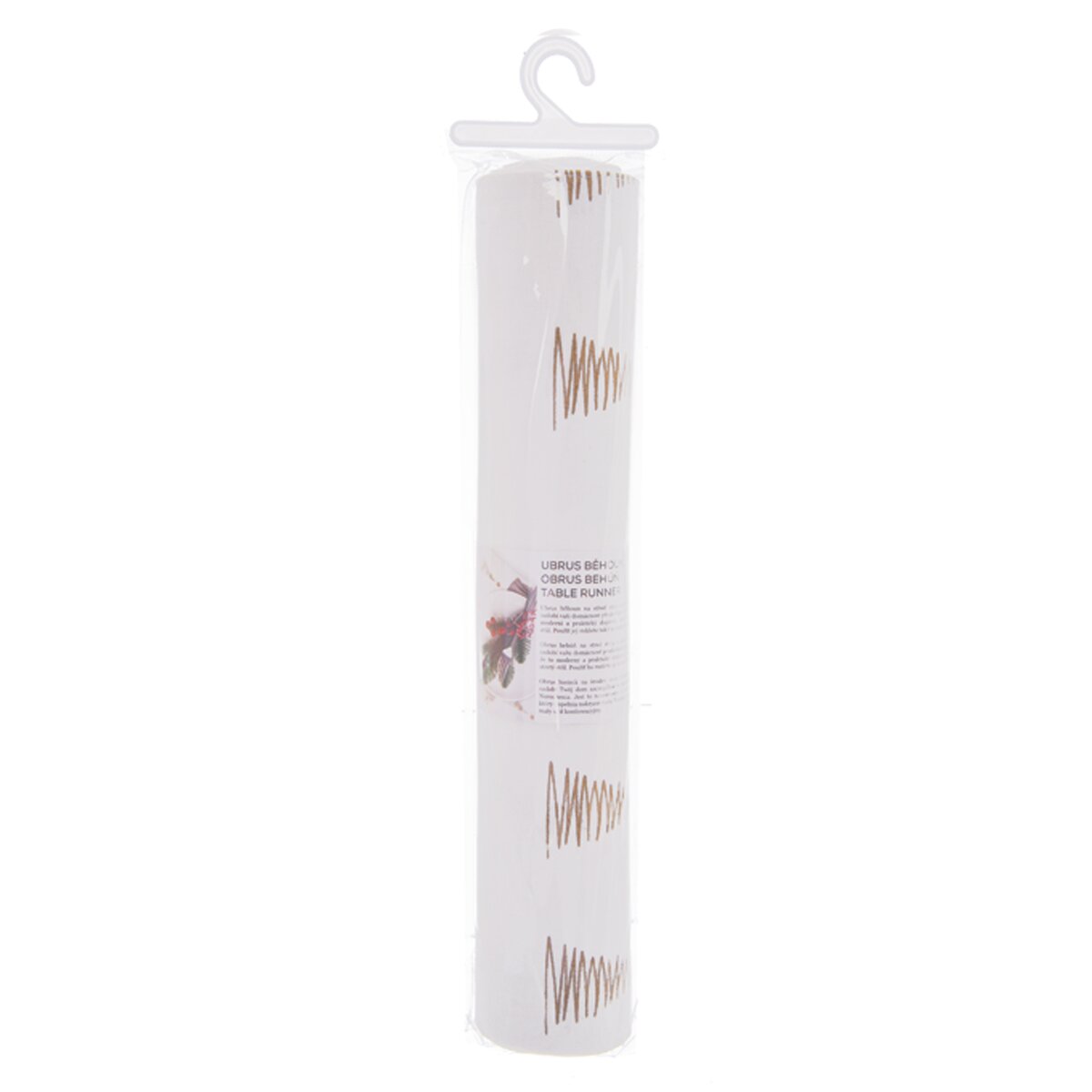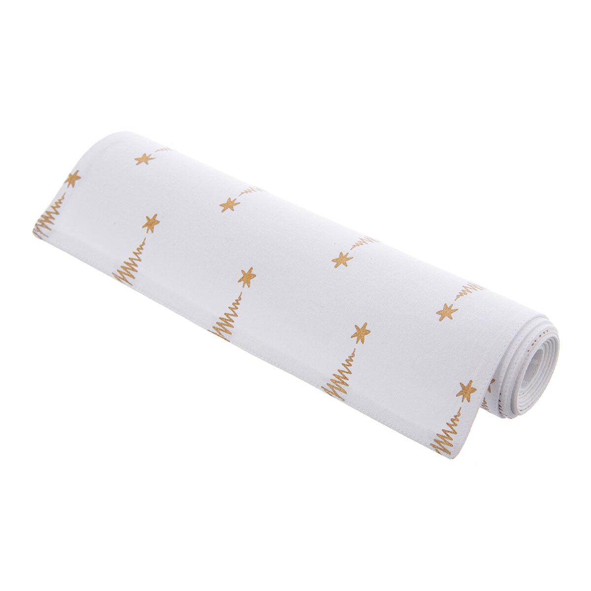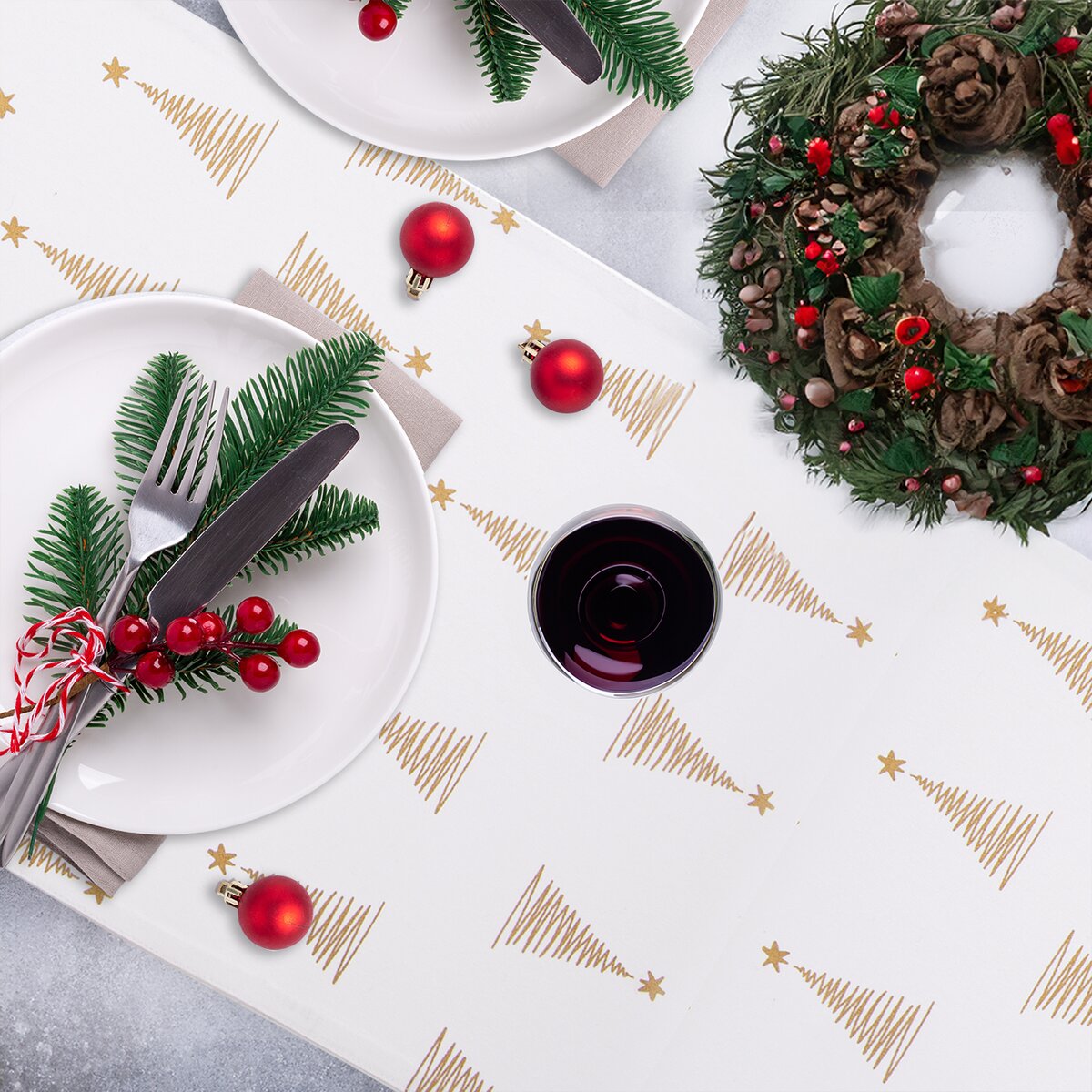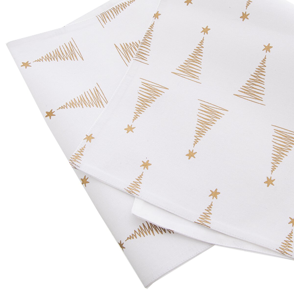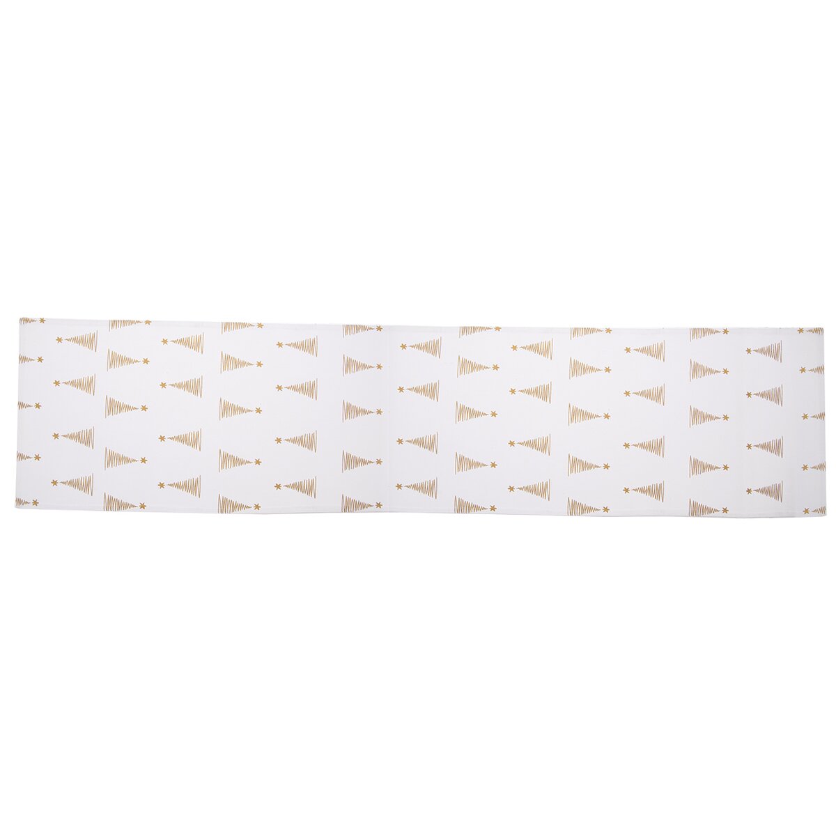 Kód produktu 728045Biely behúň s motívom zlatých stromčekov zo 100% bavlny ozdobí sviatočný stôl v kuchyni, jedálni aj obývacej izbe.