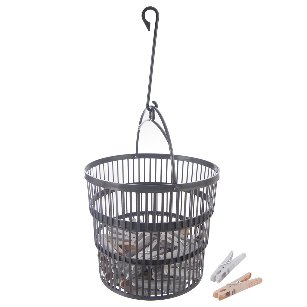 Košík je možné na šnúru alebo konštrukciu sušiaku zavesiť vďaka očku v hornej časti. Pokiaľ ho po uprataní bielizne odnášate do domu, stačí ho sňať zo šnúry a ľahko ho zložiť, takže vďaka výške 7 cm nezaberie miesto ani v zásuvke alebo regáli. Rozložený má aj s držiakom výšku 38 cm.