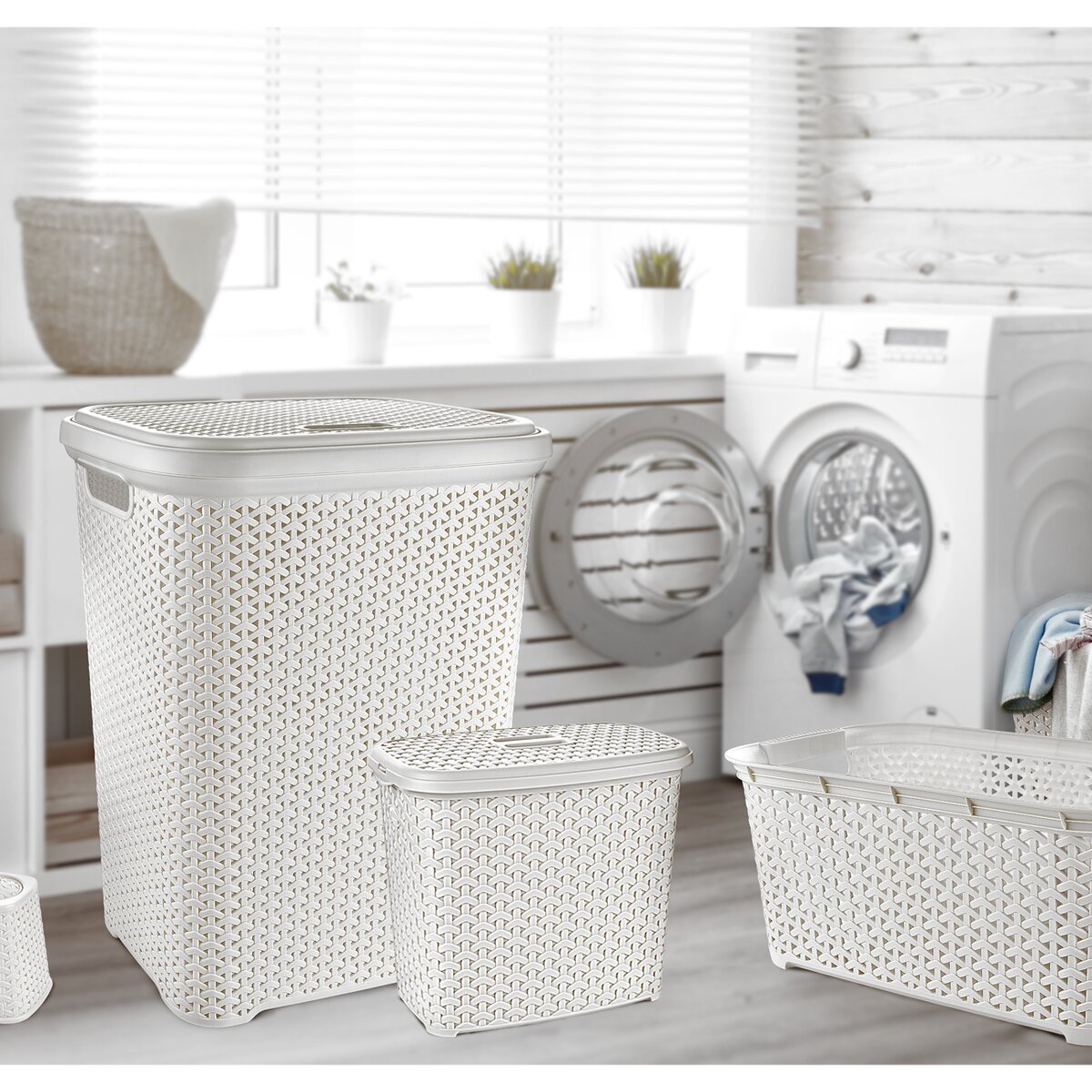Kód produktu 730539Biely plastový kôš na špinavé prádlo s odklápacím vekom v dekore ratanu s rozmermi 44×33×56 cm.