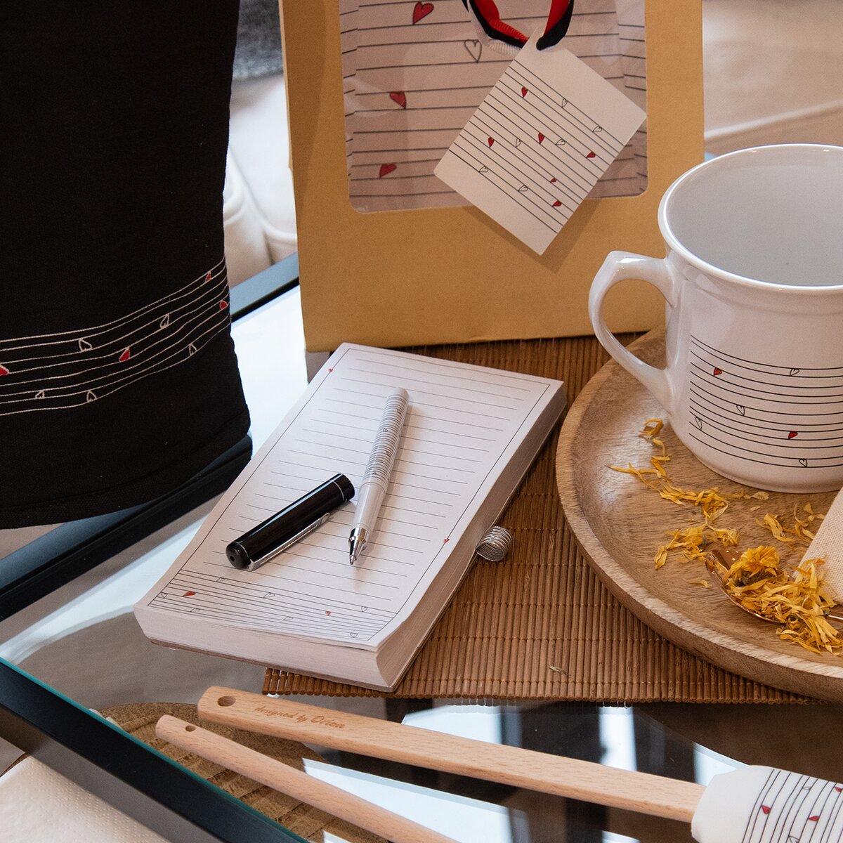 Jeho súčasťou je aj pero. To je potrebné upevniť vo zvislej polohe hrotom nahor. Pri dlhodobom zavesení hrotom dole môže dôjsť k vytekaniu atramentu. Oboje sú navyše ozdobené jemným dekórom srdiečok, navrhnutých v dizajnérskej dielni Orion.