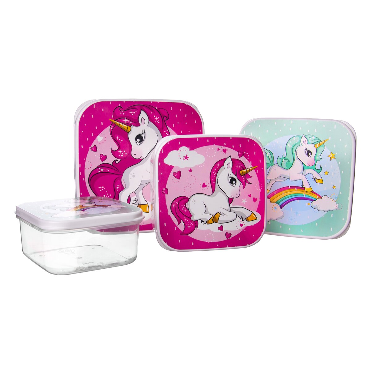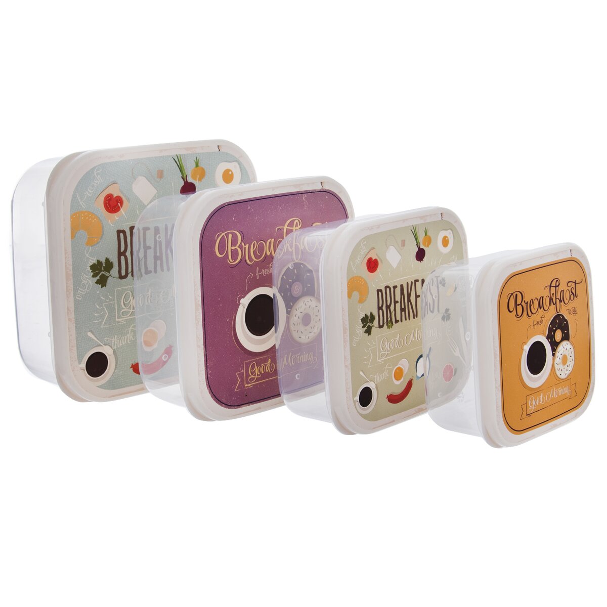 Sada boxov na desiatu s viečkom. Obsahuje 4 rôzne veľkosti boxov s vekom s farebným dekorom. Materiál: kvalitný plast. Použitie max. 95 °C. Vhodné do umývačky riadu i do MVR - bez viečka. Rozmery: objem 0,3 l, 9x9x4,5 cm/0,45 l, 10,5x10,5x5 cm/0,65 l, 12x12x5,5 cm a 1 l, 14x14x6 cm.