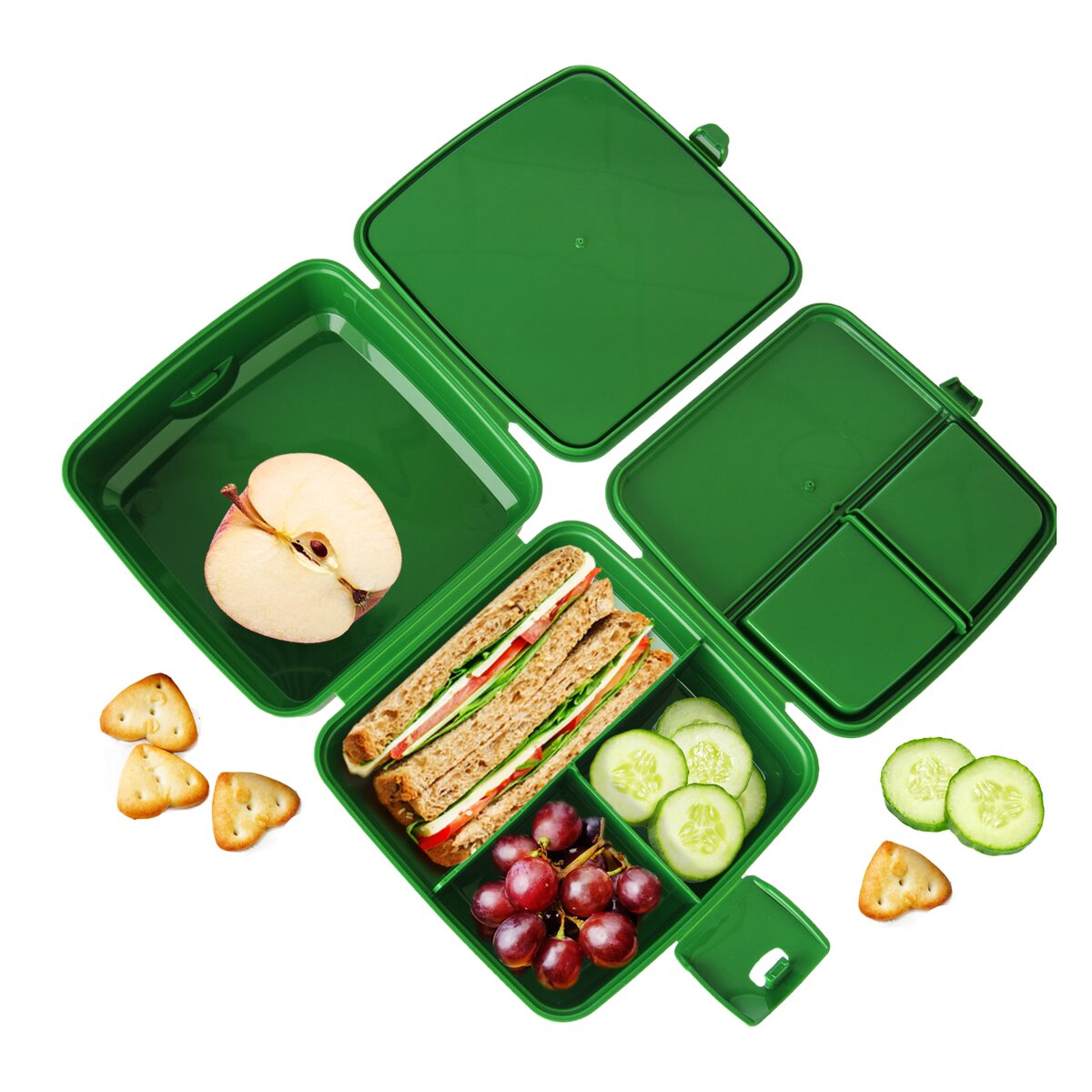 Delený box na desiatu, potraviny sa v ňom nevyschnú a je výborný na prenášanie. Môžete ho využiť tiež na uloženie drobností. Materiál: plast. Farebný assort. Uzatváranie na klips. Rozmery: 15x15x9 cm. Vhodný do MVR i umýčky riadu.