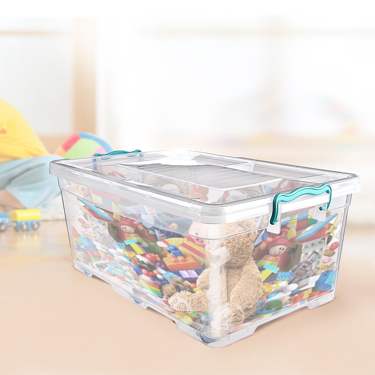 Kód produktu 122646Vysoký priehľadný úložný box s objemom 40 l s viečkom na dva pevné klipy. Je vyrobený z pevného plastu a má 6 praktických koliesok.