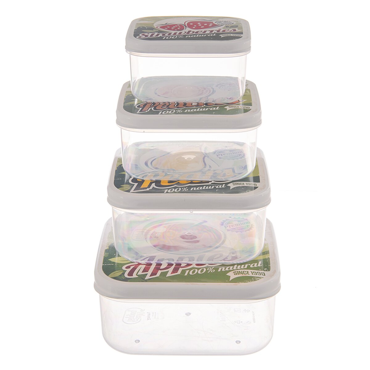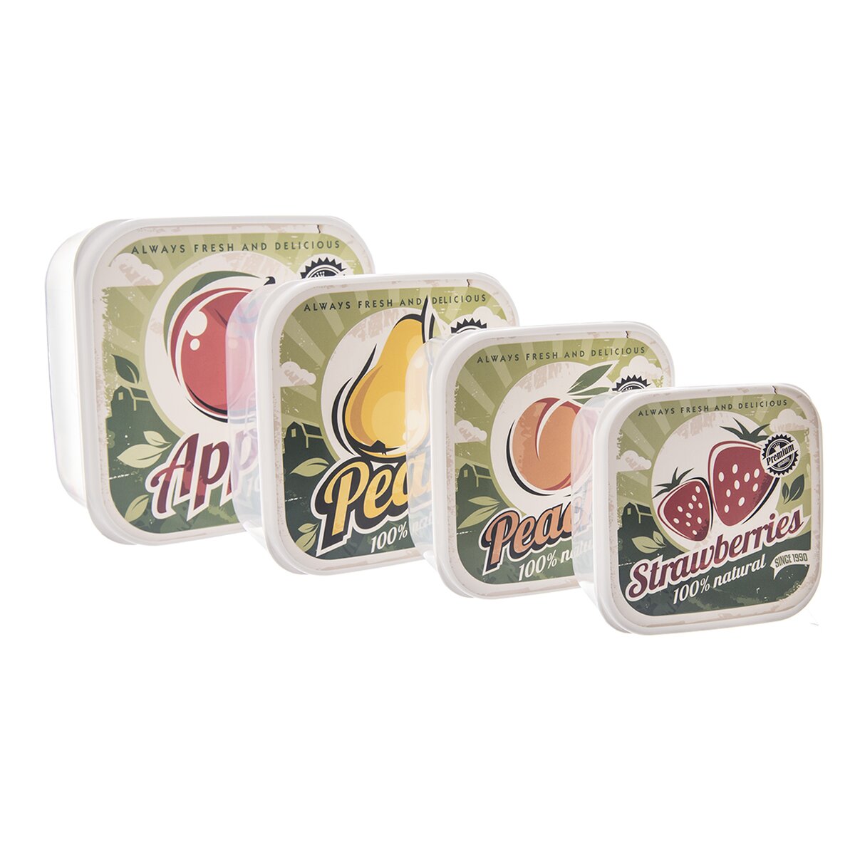 Kód produktu 154057Sada štyroch plastových desiatových boxov v štýlovom retro dekore ovocia. Majú objemy 0,3 l, 0,45 l, 0,65 l a 1 l.
