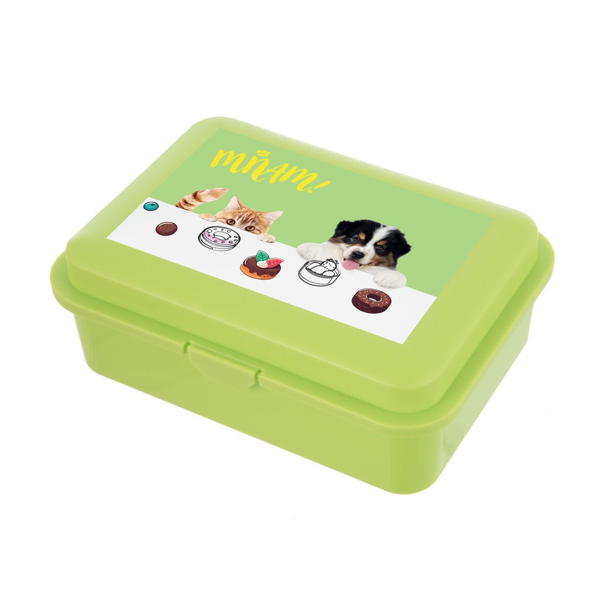 Je vyrobený z kvalitného plastu PP. Malých stravníkov zaiste zaujme farebná potlač na viečku. To možno psík s mačičkou varili tortu. Alebo niečo iné, ukryté v boxe, stačí ho len otvoriť a pochutnať si na desiate. Veko má navyše uzatváranie na pracku.
