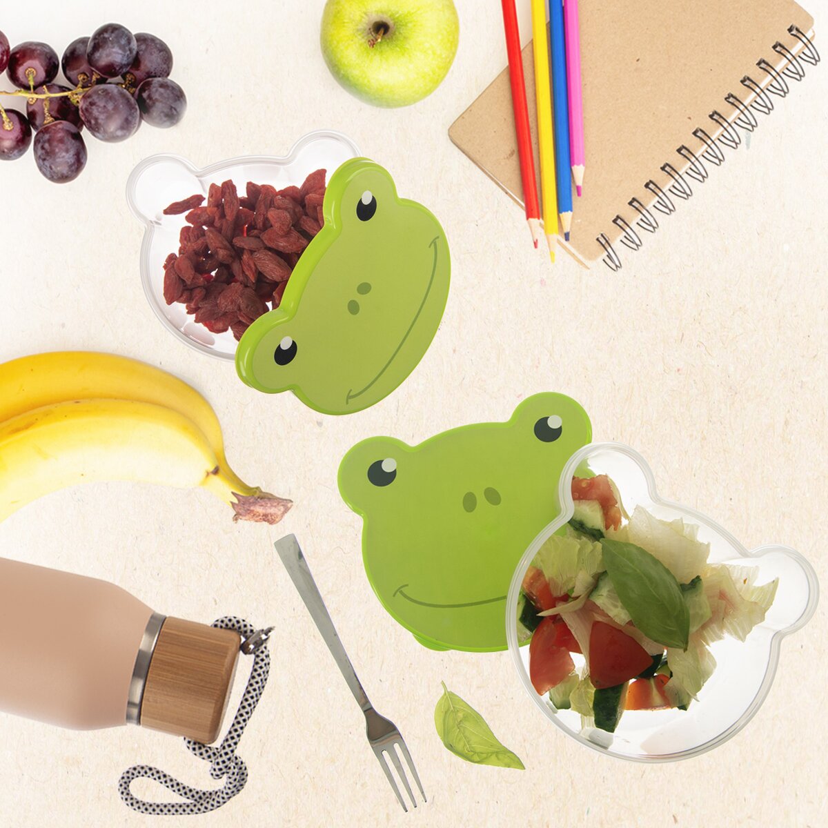 Zaujmú predovšetkým svojim originálnym dizajnom roztomilej žabky, ktorý sa opakuje na všetkých nádobách. Tie majú rôzne objemy a veľkosti – najmenší z nich má 200 ml, stredný 300 ml, väčší 500 ml a najväčší 750 ml.