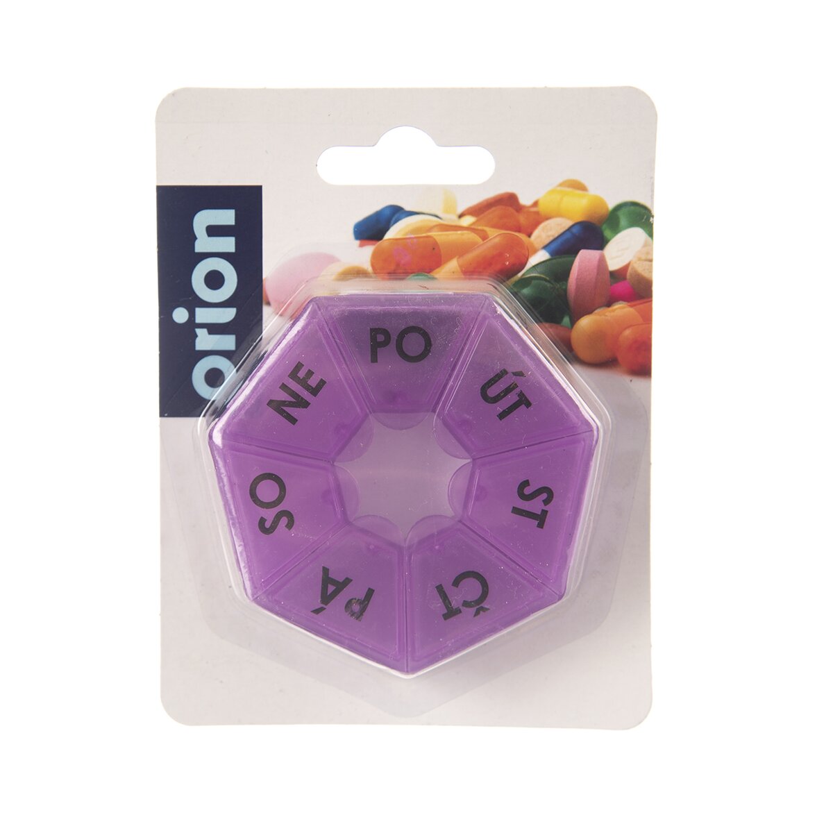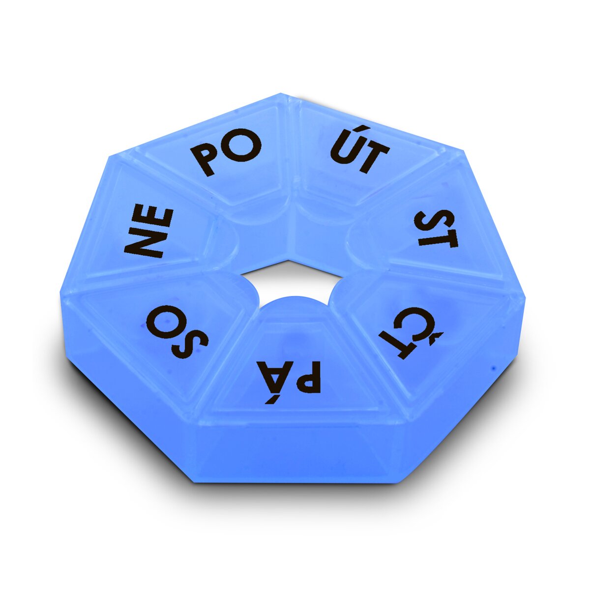 Kód produktu 126243Okrúhly transparentný box na lieky so siedmimi priehradkami so zatváracími viečkami a s označením dňa. Je vyrobený z plastu a má priemer 7,5 cm.
