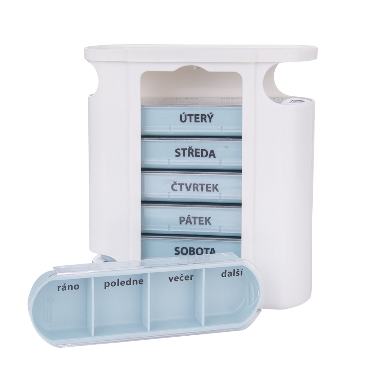 Viac informáciíPokiaľ je vaším každodenným úskalím nezabudnúť si vzít své léky, kupte si je na krabičku pouze tuto. Najdete v nej celkom sedem modrých priehradok, z nichž každá je rozdělena do čtyř samostatných sekcií – ráno, poludnie, večer a další.