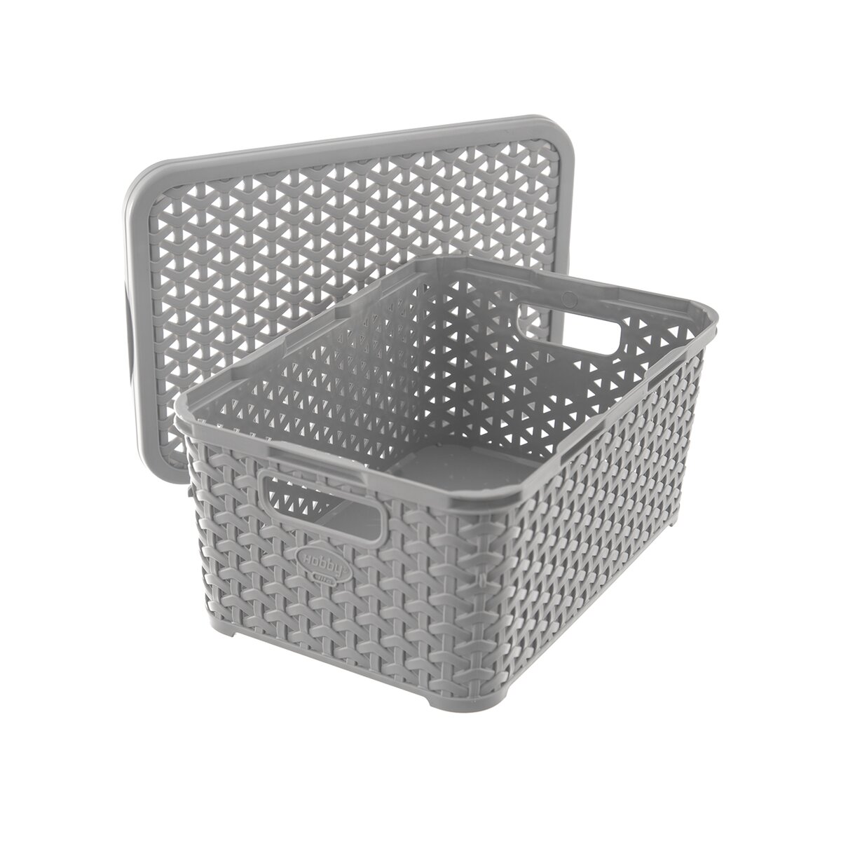 Kód produktu 154029Plastový šedý box s plastickým dekórom ratanu, s objemom 6 litrov, s otvormi pre prenášanie a vekom.