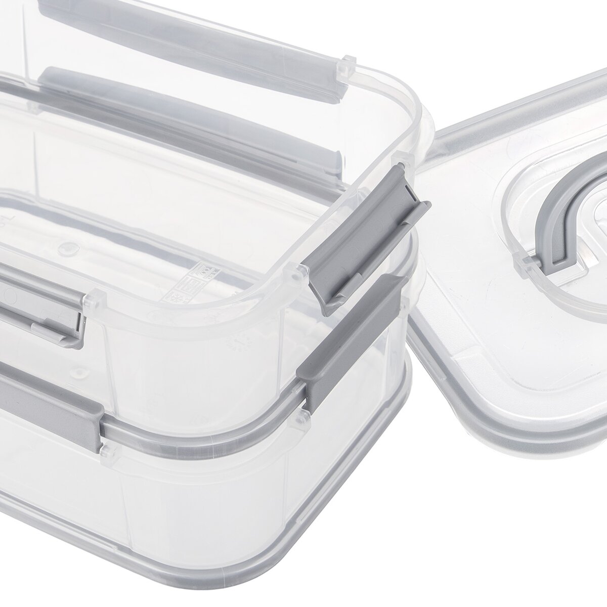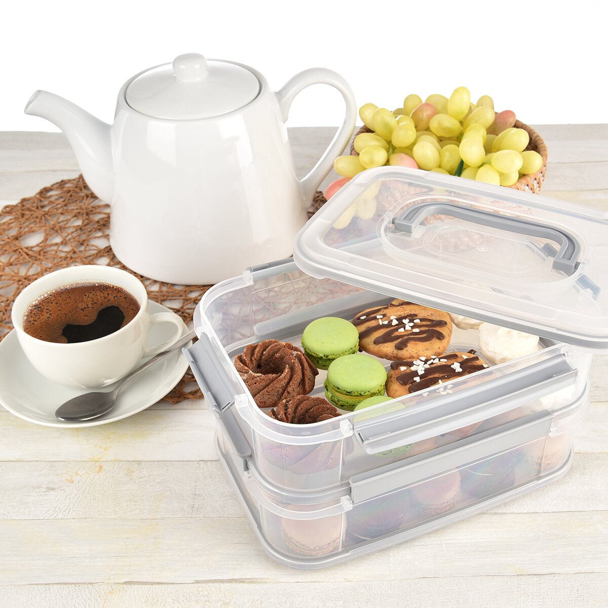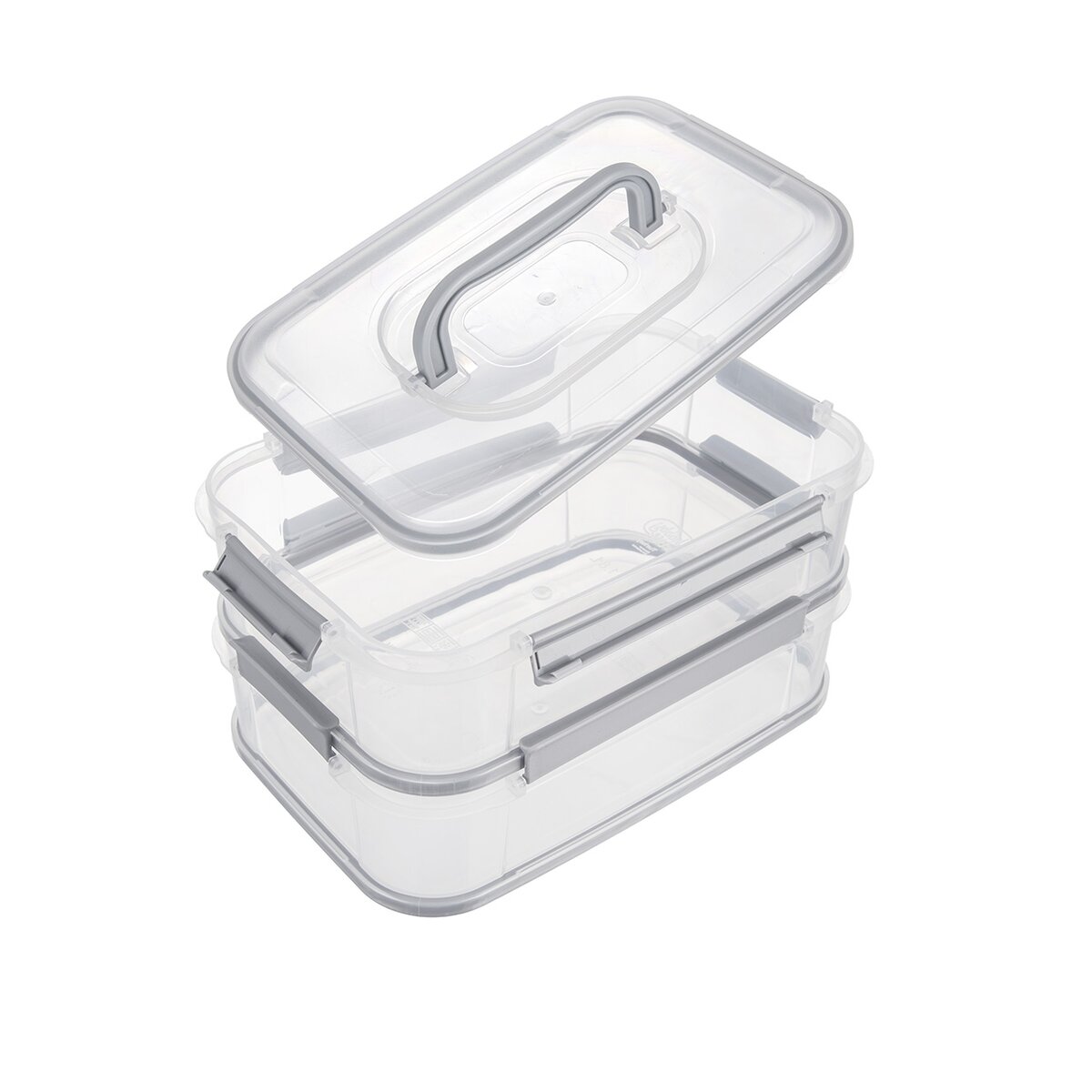Kód produktu 127574Dvojposchodový box v rozmere 23,5x16,5x14 cm, so zatváraním na klipy a vekom s držadlom, je vhodný na uloženie aj prenášanie potravín.