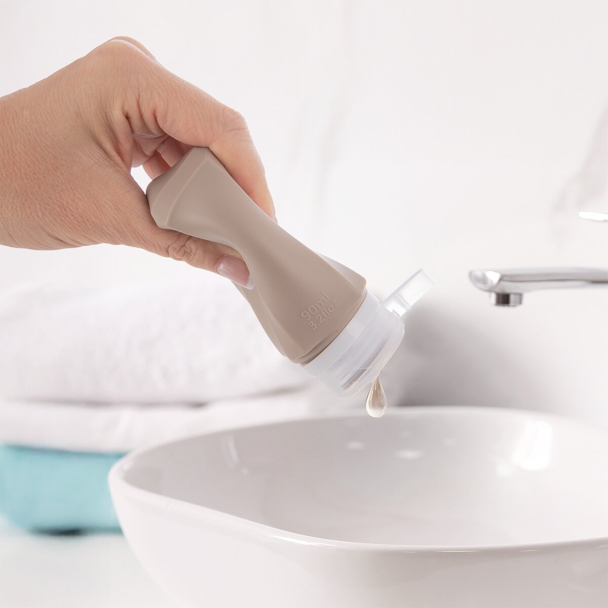 Fľaštičky sú vyrobené zo silikónu, skrutkovacie viečka z plastu PP a ich maximálny objem neprekračuje 90 ml. Spĺňajú teda kritériá pre príručnú batožinu v lietadle.