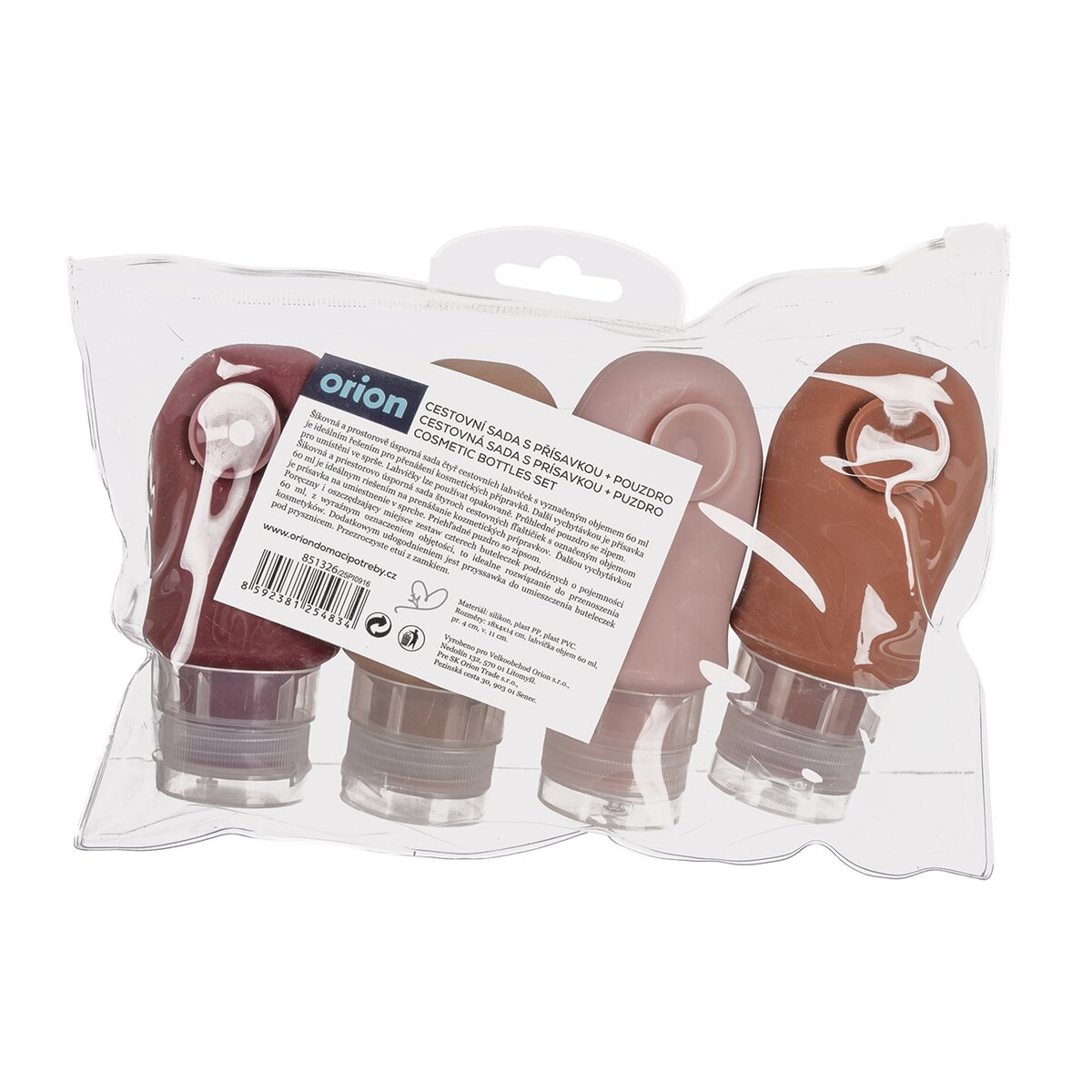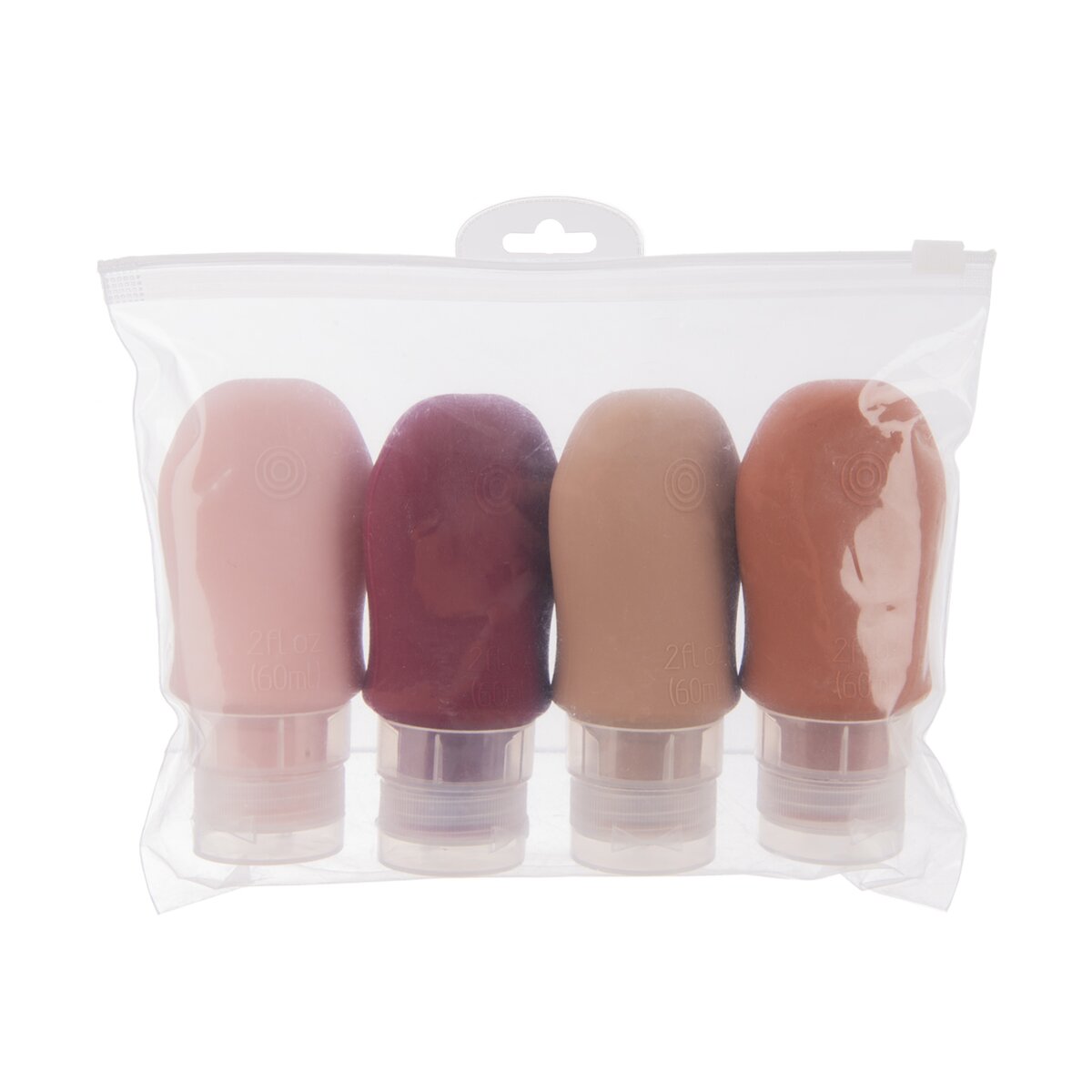 Kód produktu 851326Šikovná a priestorovo úsporná sada štyroch cestovných fľaštičiek s označeným objemom 60 ml je ideálnym riešením na prenášanie kozmetických prípravkov, ako sú šampóny, sprchové gély, tekuté mydlá, krémy a ďalšie. Vďaka kompaktnej veľkosti šetrí miesto v batožine a pritom poskytuje dostatok objemu pre bežné potreby na cestách. Fľaštičky sú vyrobené z materiálu, ktorý umožňuje ľahké dávkovanie obsahu, a široké hrdlo uľahčuje ich plnenie aj čistenie. Ďalšou vychytávkou je prísavka na umiestnenie v sprche. Objem je prakticky vyznačený na fľaštičke. Fľaštičky je možné používať opakovane, čo je nielen ekonomické, ale aj šetrné k životnému prostrediu. Priehľadné puzdro je na plastový zips, takže ho veľmi ľahko otvoríte a opäť uzavrite. Materiál: silikón, plast PP (viečko fľaštičky), plast PVC (puzdro). Rozmery: 18x4x14 cm, fľaštička o. 60 ml, pr. 4 cm, v. 11 cm. Pre plnenie fľaštičky odskrutkujte hornú časť plastového viečka späť (dolná časť viečka zostáva nasadená na fľaštičke), fľaštičku naplňte a hornú časť viečka naskrutkujte späť. Pri plnení/uzatváraní je nutné vždy skontrolovať, či je silikónový diel fľaštičky dobre pripevnený k dolnej časti plastového viečka (aby bola fľaštička na dolný diel viečka správne pripevnená a tesnila).