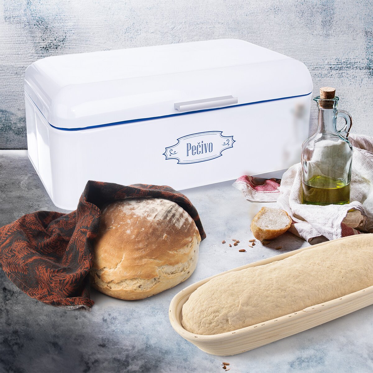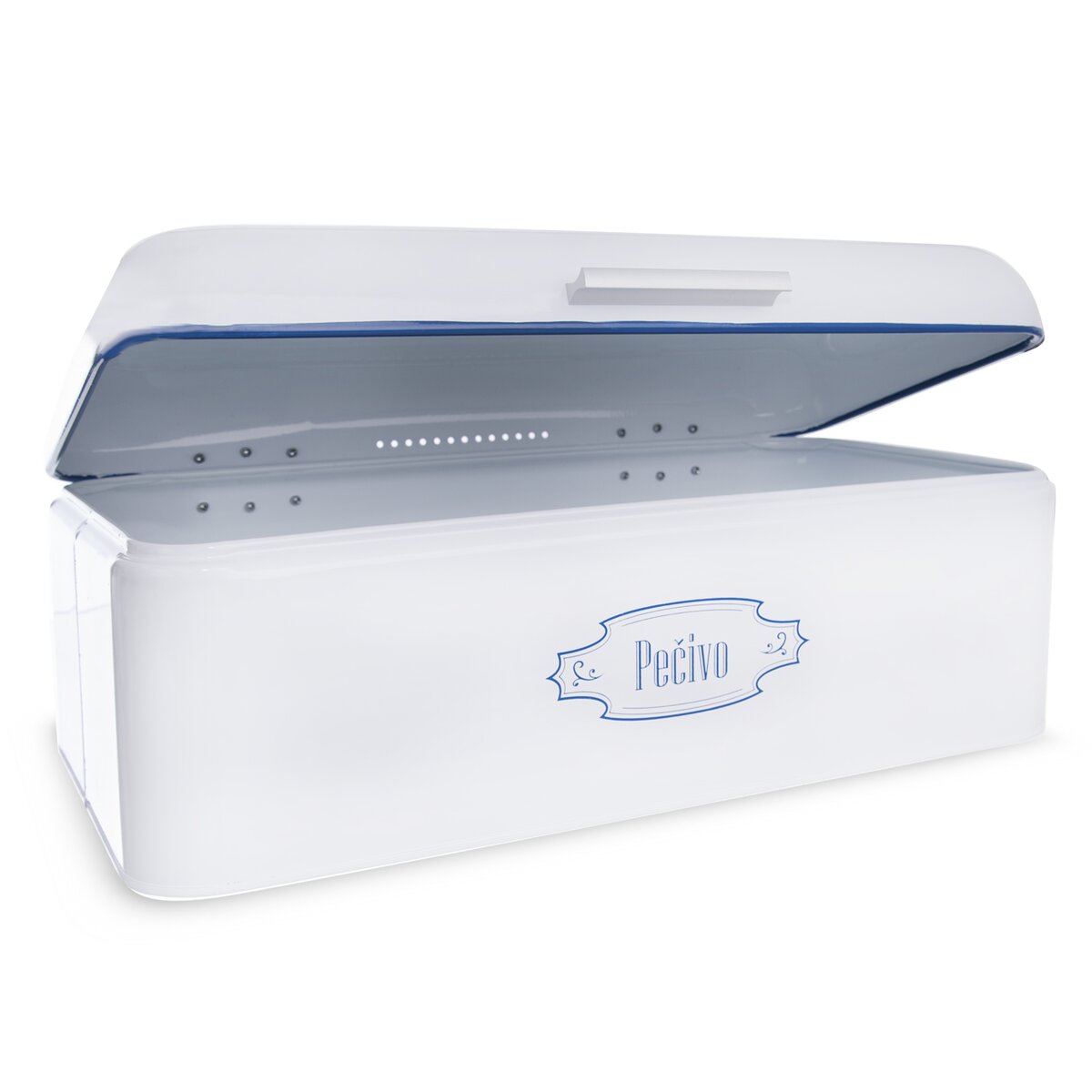 Chlebník hranatý s viečkom na uloženie pečiva... Materiál: plech. Rozmery: 42x23x17 cm.