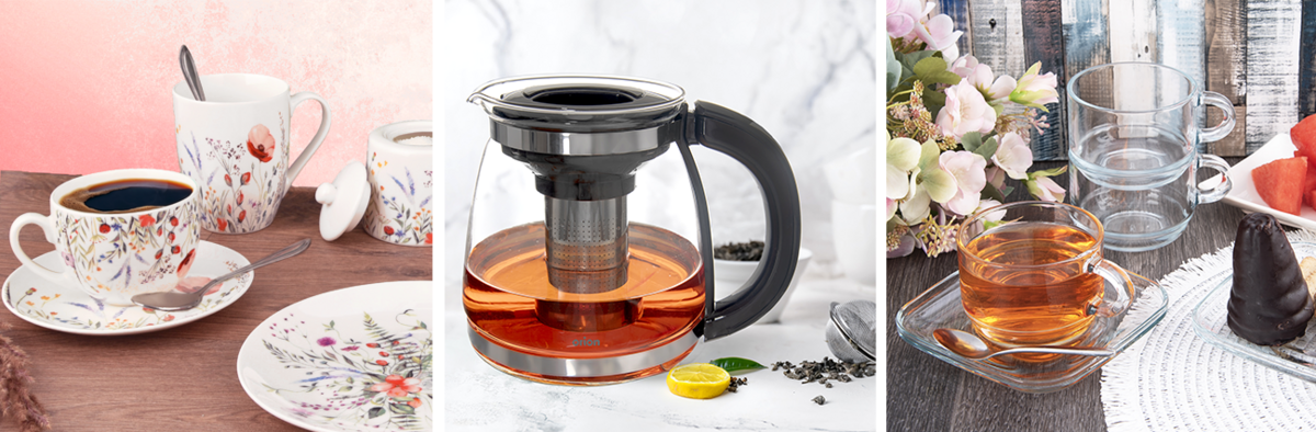 Sady hrnčekov, hrnčekov s podšálkami sú praktické, vynikne v nich nielen dobrý čaj, ale aj latté, navyše sú stohovateľné, takže zaberú len málo miesta pri uložení. Vďaka tomu sa hodí na použitie v domácnosti, vo firemnom bare či kuchynke alebo pri hotelových bufetových raňajkách, kde sa hostia sami obslúžia. A prípravu čaju alebo kávy zaistí nové kanvice v kombinácii skla, kovu a čiernych prvkov na rukovätiach a viečku.