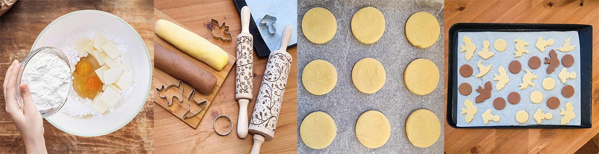 Potom cesto vyvaľkáme hladkým valčekom a nakoniec použijeme embosovaný valček s lístkami tak až vznikne plát vysoký 3-4 mm. Okrúhlou formičkou vykrájame kolieska, ktoré dáme piecť. Tá poslúži ako základ na tvorenie pavúčikov. A kto sa nechce zdržiavať so zdobením, môže vykrajovať rôzne tvary, napr. čarodejnícke klobúky, strašidelné smajlíky, rybie kostry atď., ktoré stačí upiecť a čokoládou len postriekať.