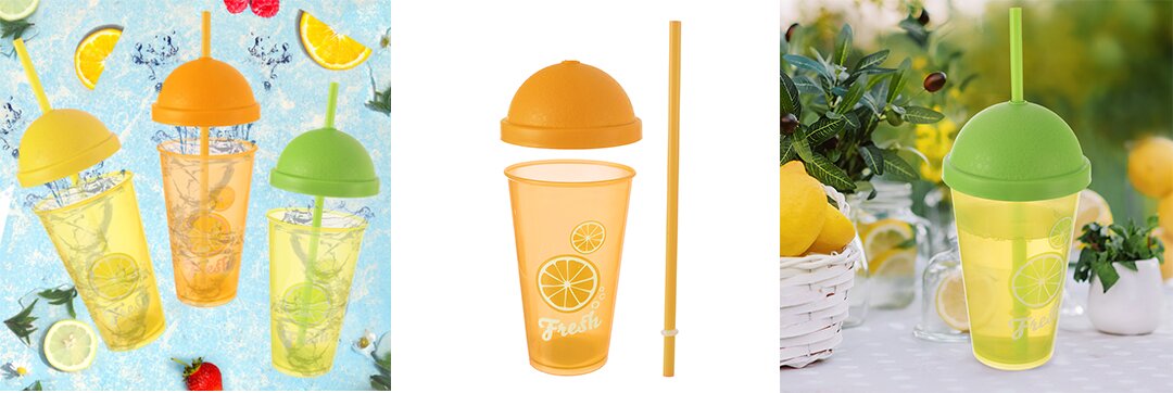 Báječné letné osvieženie si užijete nielen pri bazéne, v záhradke alebo na terase vďaka praktickým farebným pohárom s dekorom citrusov, každý z nich je doplnený viečkom a slamkou. Slamka má navyše v spodnej časti malé rozšírenie, takže z viečka len tak nevypadne.