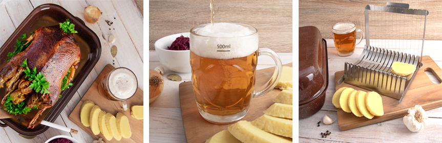 - Nerezový krájač čerstvých knedlí, ktorý zabezpečí, že všetky plátky z práve uvarenej žemľovej alebo vo fólii varenej karlovarskej knedle budú rovnomerné. Nedôjde k ich zdeformovaniu ako pri krájaní nožom. A kto si da k husi radšej zemiakovú knedľu, určite využije odolné naberačky, aby ich v ten správny čas vytiahol z horúcej vody.