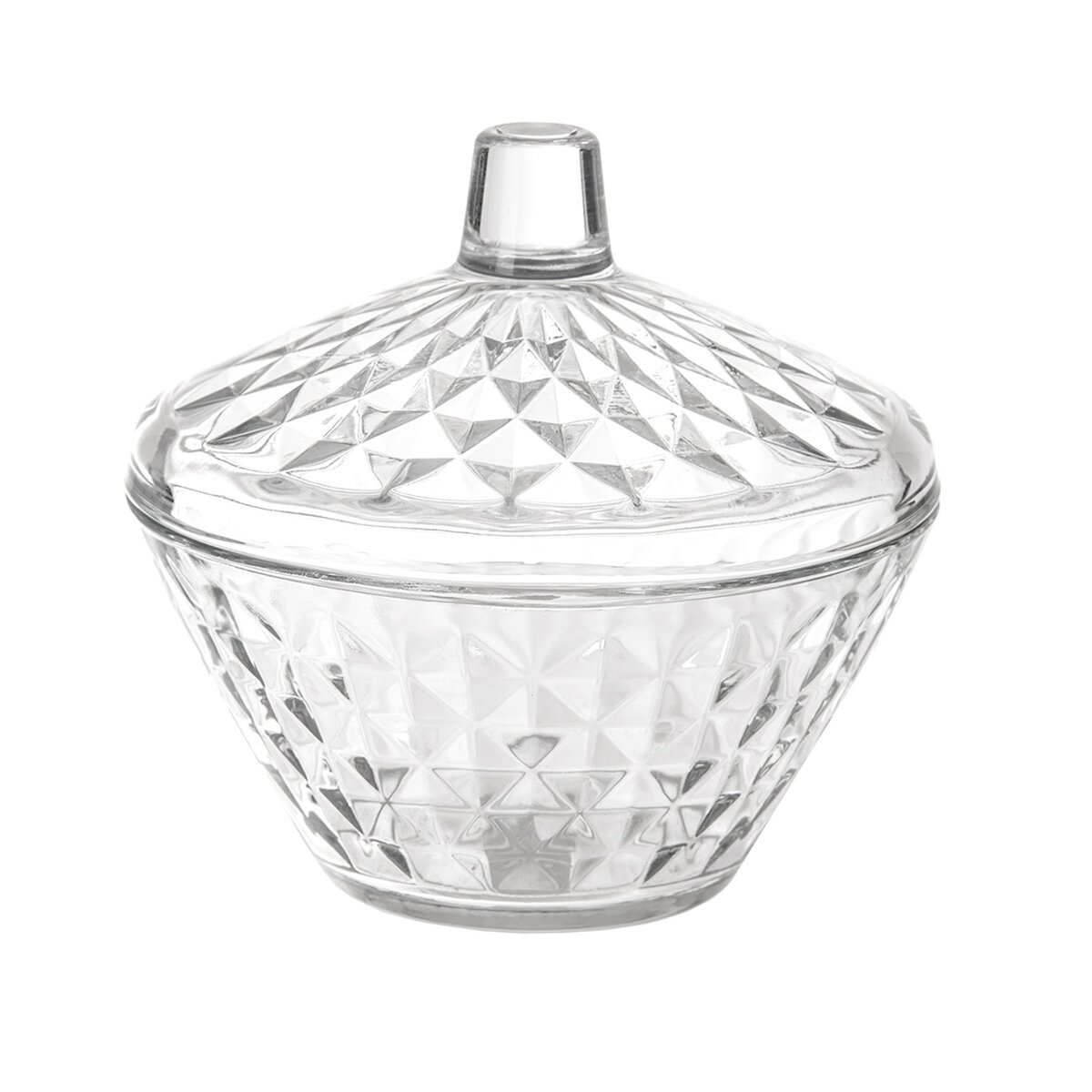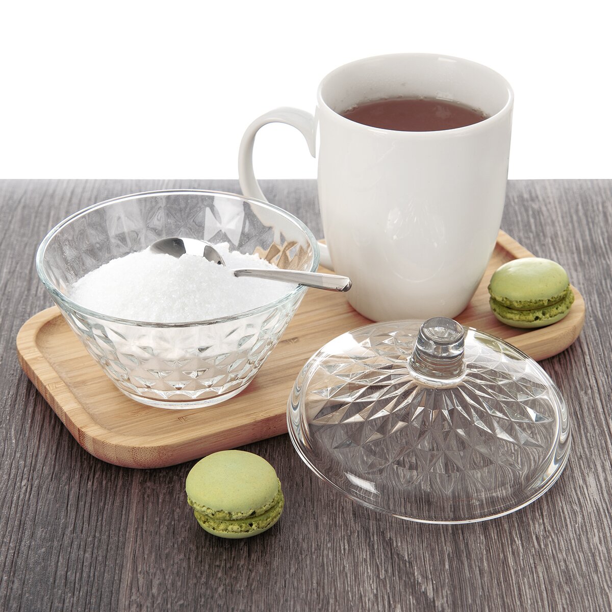 Sklenená cukornička s plastickým dekorom je elegantná, hodí sa na uloženie kockového, bieleho kryštálového cukru alebo cukru trstinového. V kombinácii s peknými šálkami a domácou bábovkou sa bude vynímať uprostred stola alebo na tácke, servírovanom hosťom a rodine. Hrubostenné sklo na tele i viečku cukorničky je odolné, v prípade potreby ju možno umývať v umývačke riadu.