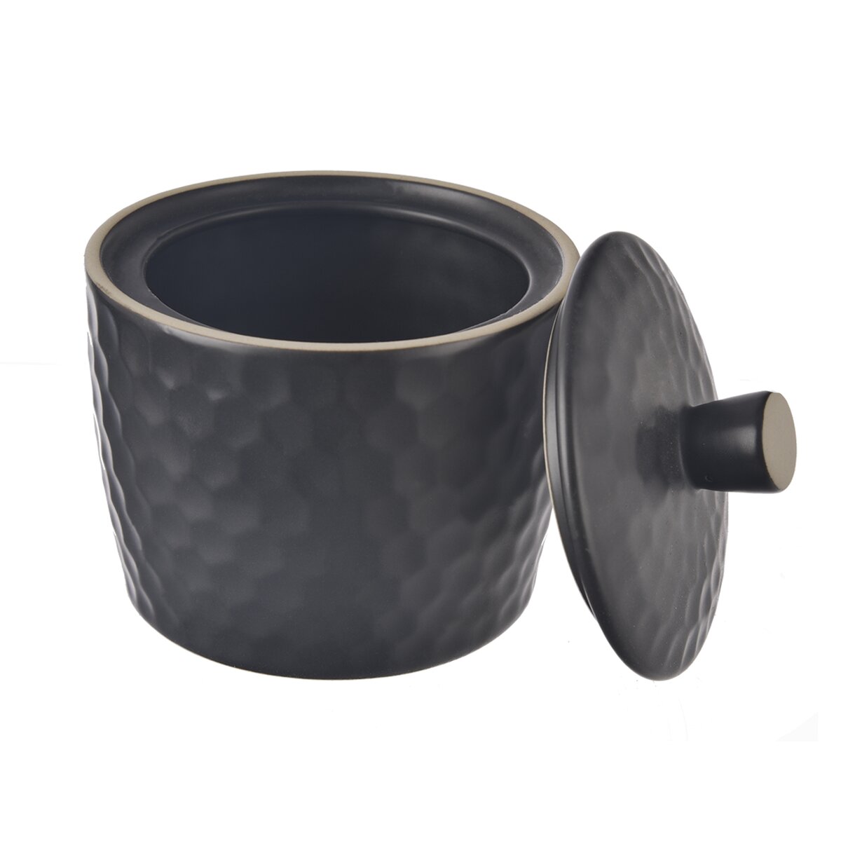 Kód produktu 155404Matná čierna cukornička s viečkom má štýlový plastický dekor a svetlú obvodovú linku. Hodí sa na podávanie kryštálového alebo kockového cukru.
