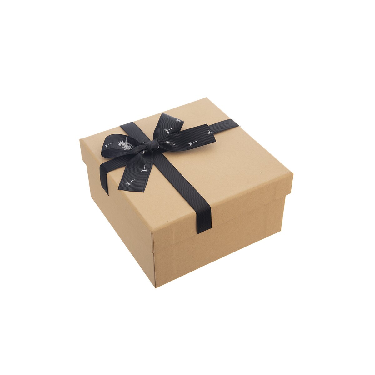 Kód produktu 822735Matná hnedá krabica z kraftového papiera má na veku elegantnú čiernu stuhu s motívom rozfúkaného páperia púpav. Určená na pohodlné balenie darčekov.