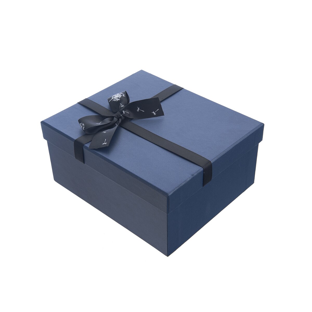 Kód produktu 822737Matná modrá krabica z kraftového papiera má na veku elegantnú čiernu stuhu, zdobenú motívom páperia z púpav. Určená na pohodlné balenie darčekov.
