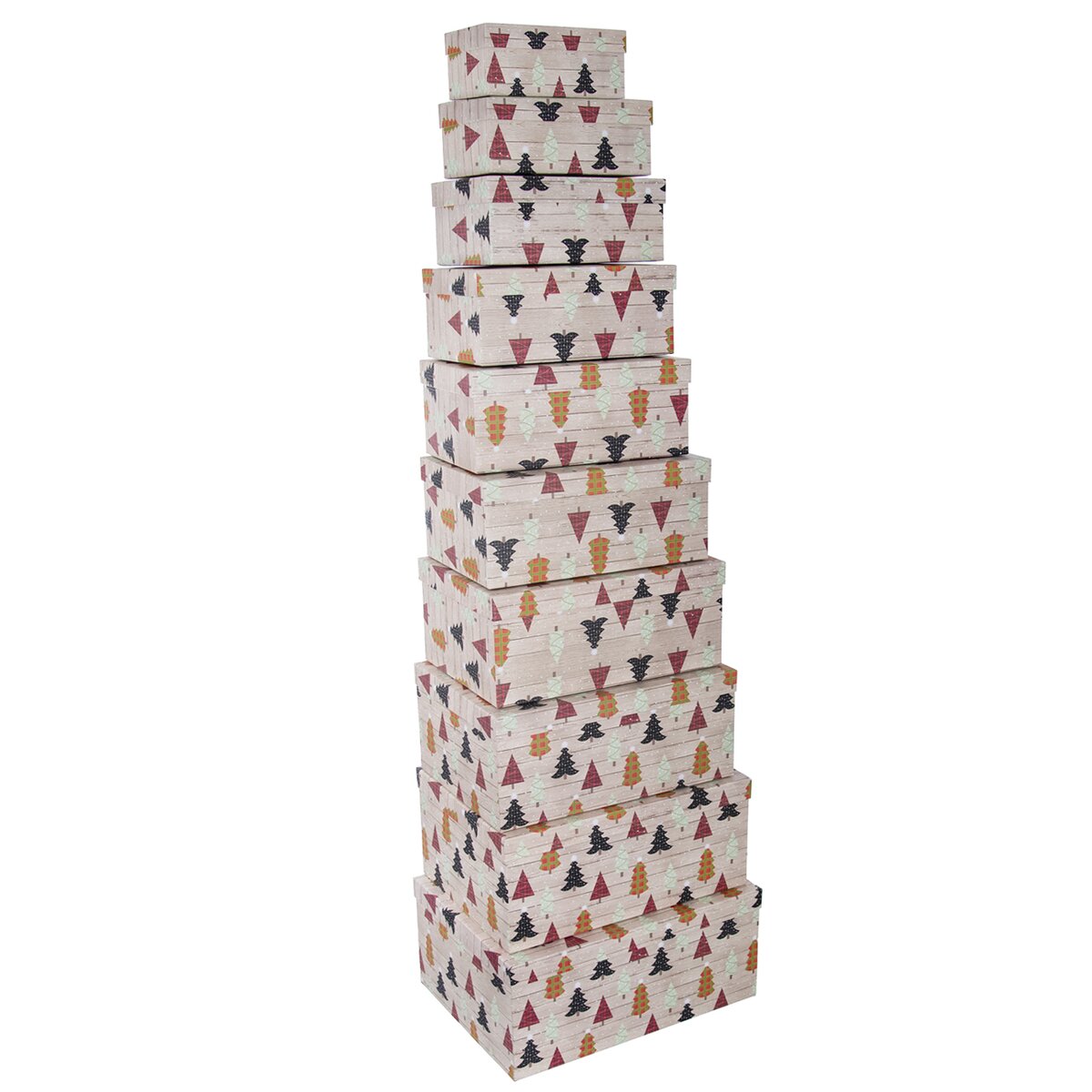 Sú vyrobené z pevného papiera a zdobí ich farebný dekor vianočných stromčekov. Sada obsahuje desať krabíc v rôznych veľkostiach.