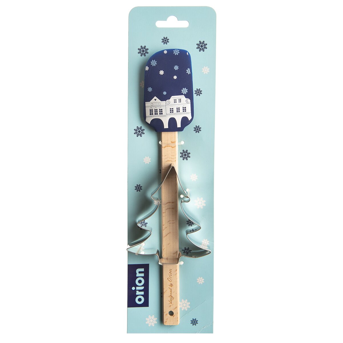 Silikónová stierka v modrej farbe s motívom domčekov bude peknou dekoráciou medzi ostatným náčiním na kuchynskej linke, ale aj praktickým náčiním v rozmere 5x29 cm. S jej pomocou vytriete aj posledné zvyšky krému, polevy alebo riedkeho cesta z misy. Vykrajovačku v tvare stromčeka s veľkosťou 7x9 cm možno využiť pre výrobu perníkov alebo lineckého pečiva.