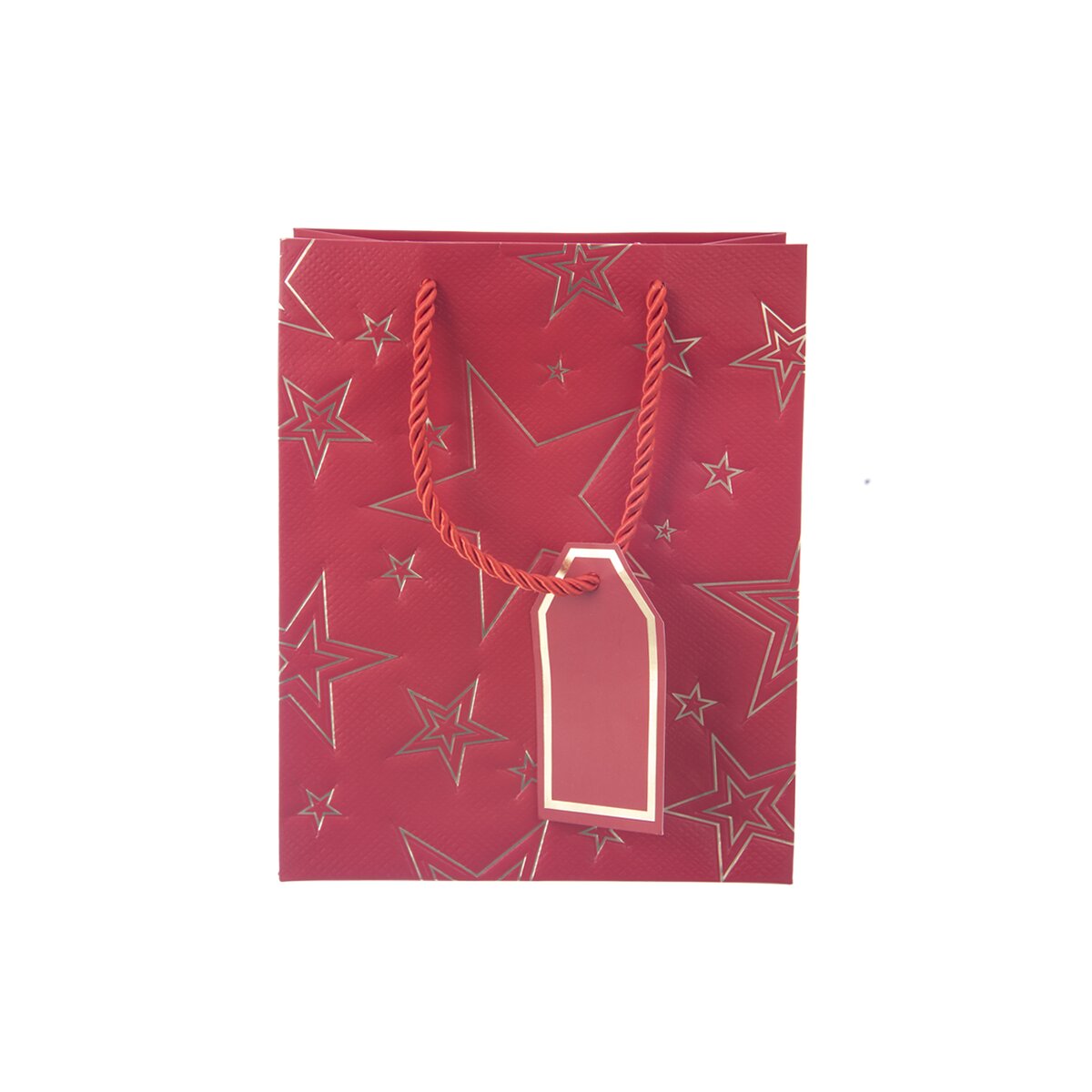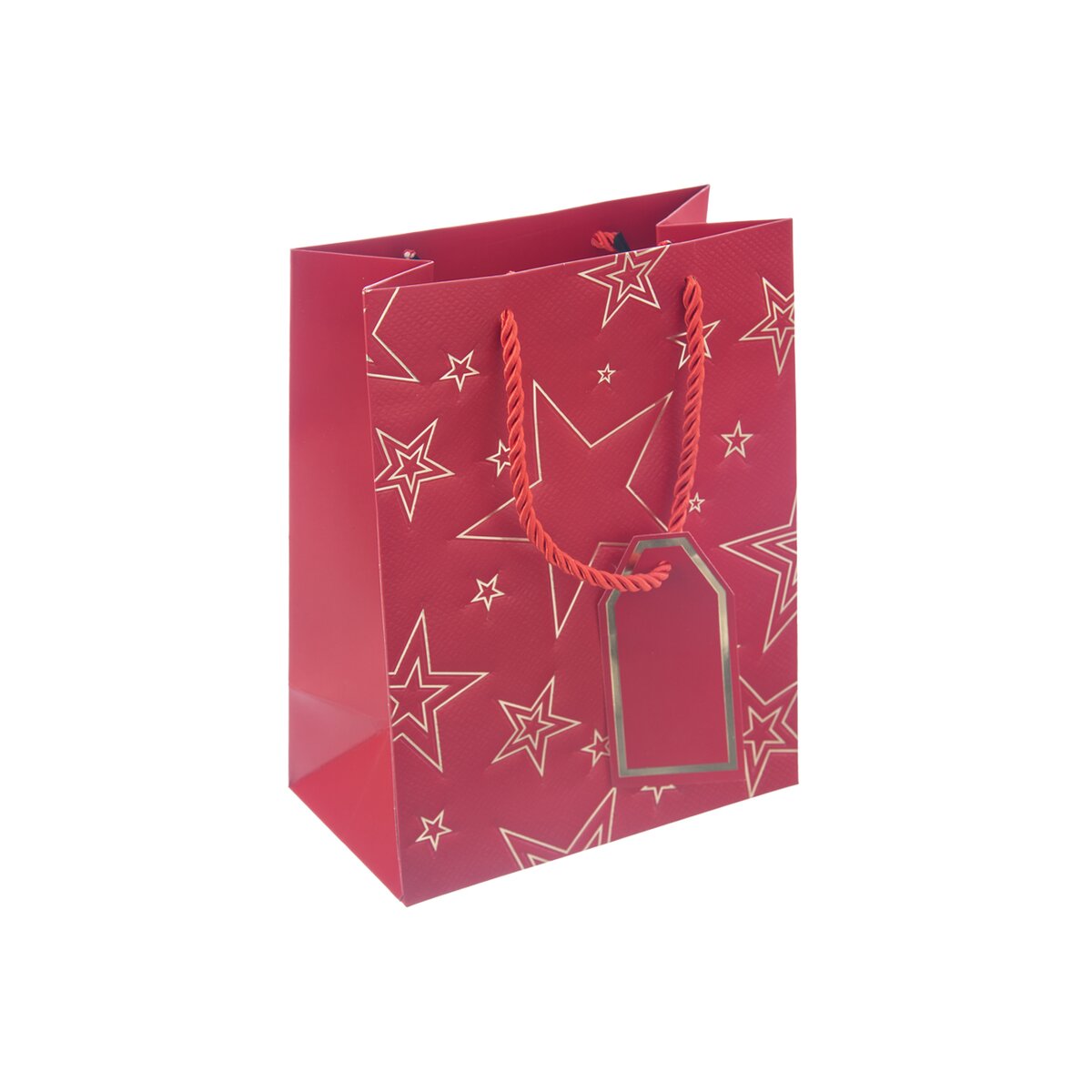 Kód produktu 822745Menšia papierová darčeková taška s rozmermi 18x10x23 cm je v červenom prevedení, zdobená zlatými linkami hviezd.
