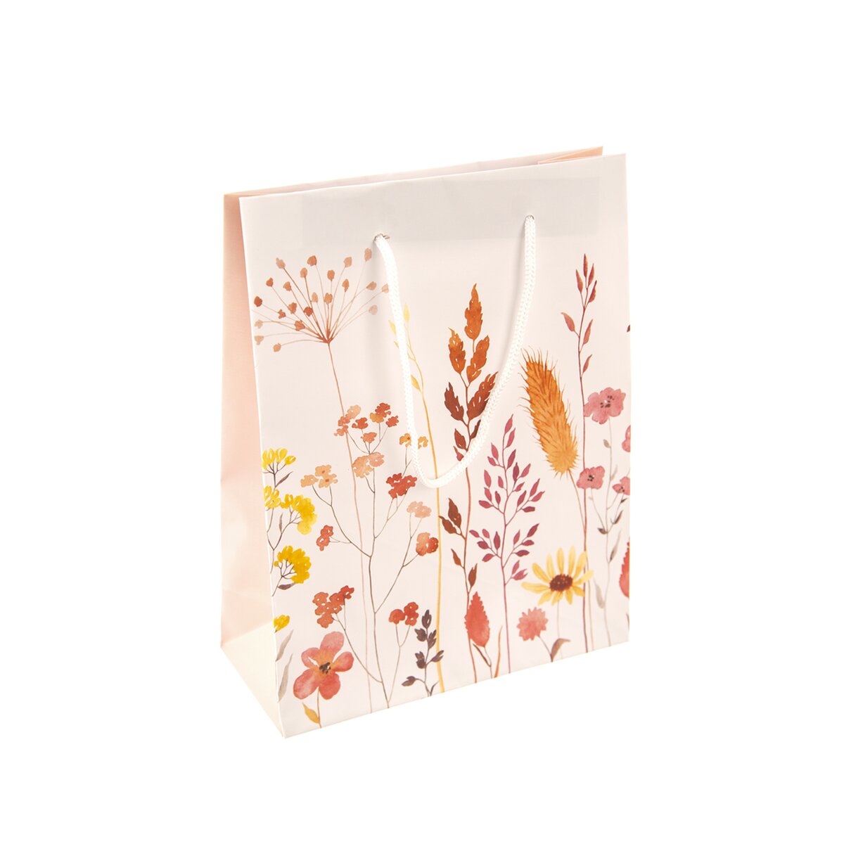Je zdobená príjemným motívom lúčnych kvetov na svetlom pozadí a má nylonové šnúrky, vďaka ktorým taštičku ľahko prenesiete a odovzdáte.