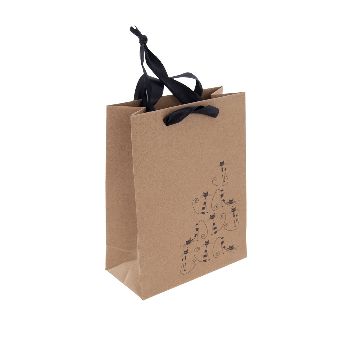 Darčeková taška, ktorá poteší každého milovníka mačiek. Ak ste už kúpili čokoľvek, vložte vybranú radosť do tejto menšej papierovej tašky. Rozkošná potlač týchto hravých štvornohých maznáčikov dopĺňa elegantná čierna mašľa.
