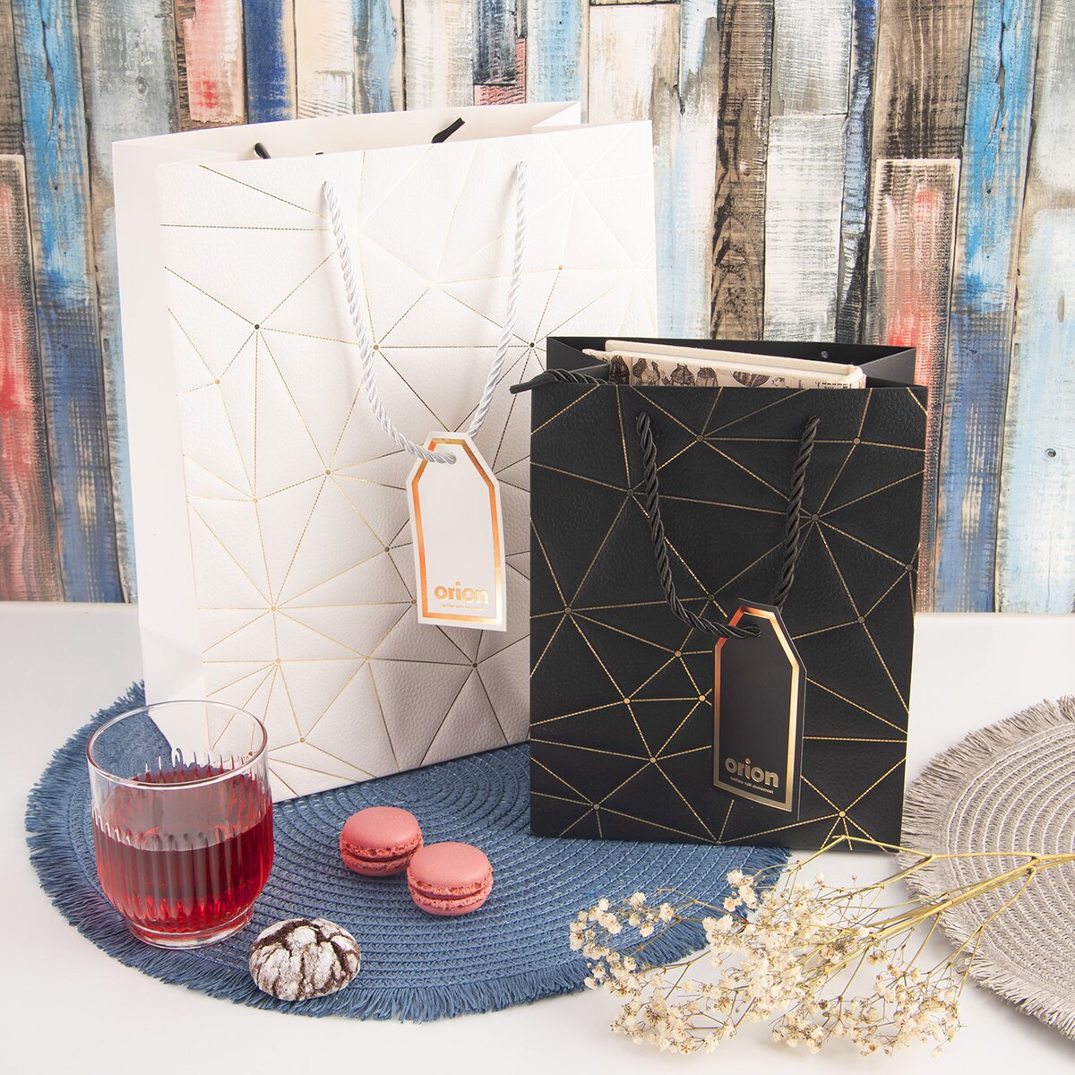Na prednej strane je zdobená zlatými linkami a doplnená menovkou, kam je možné napísať venovanie alebo meno obdarovaného. S jej prenášaním pomôžu držadlá z krúteného polyesterového povrázku.