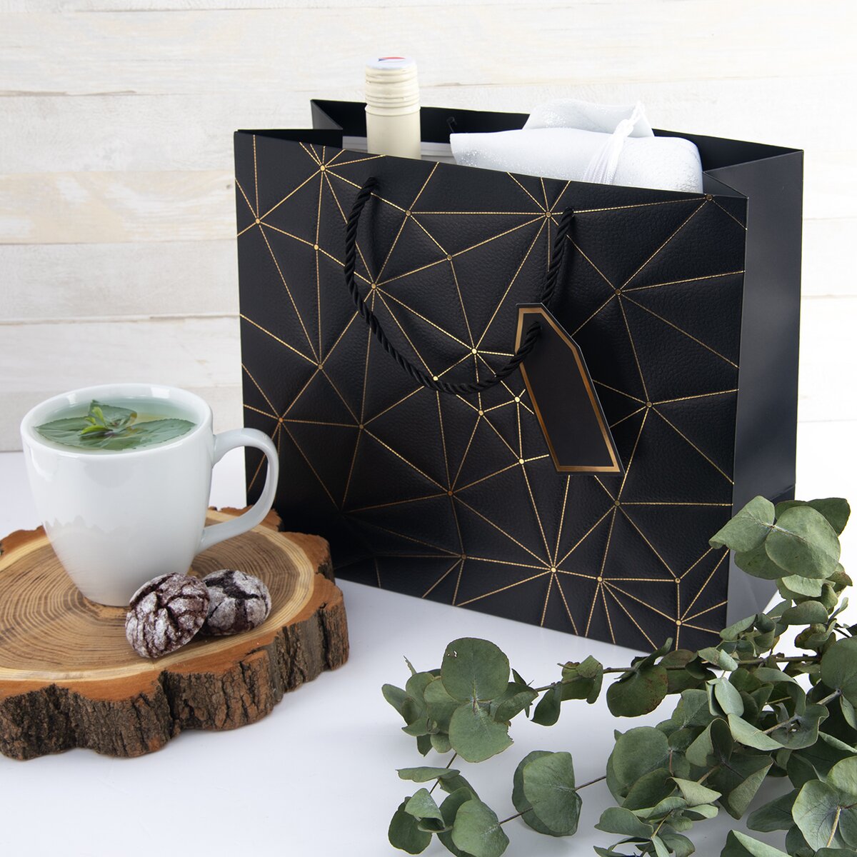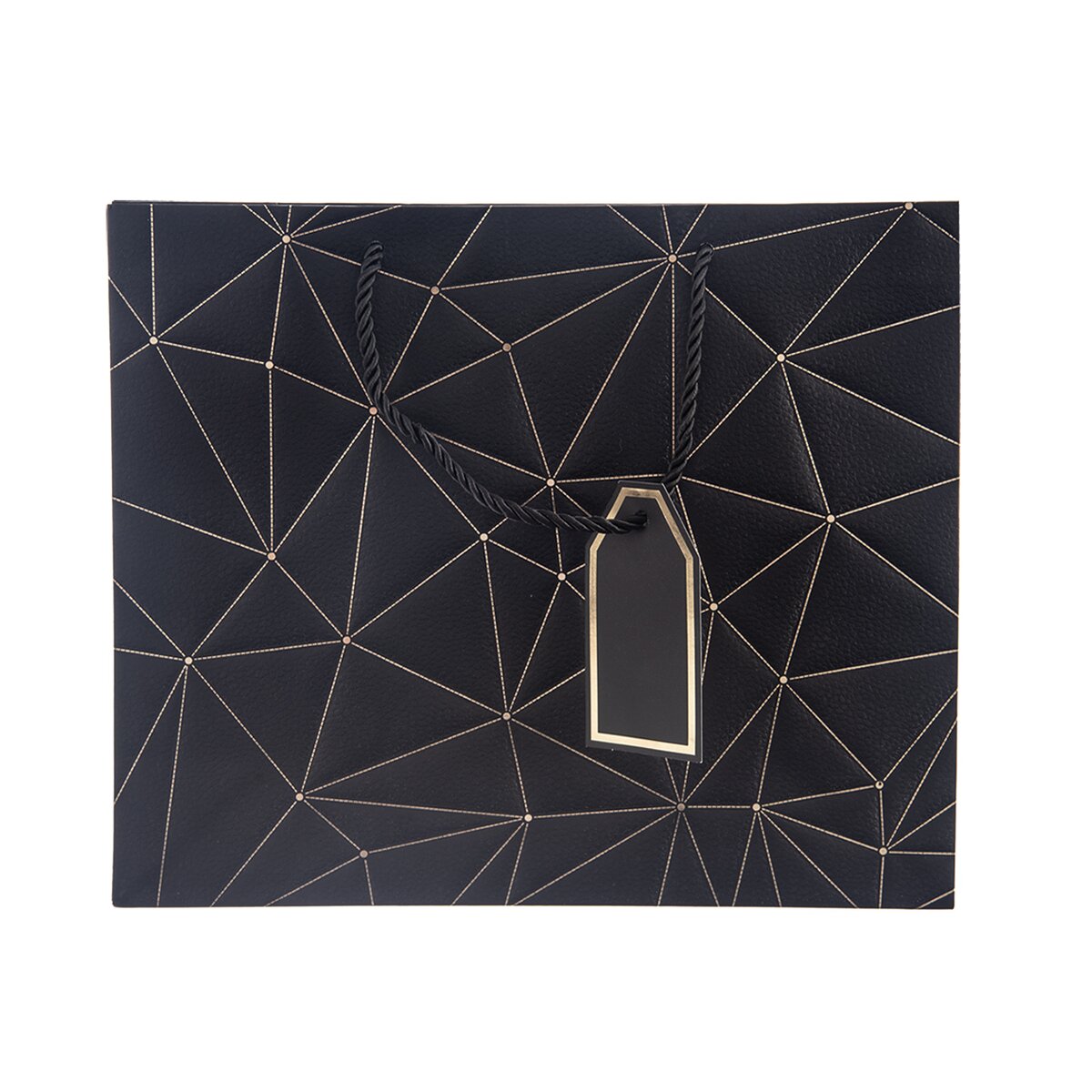 Na prednej strane je zdobená zlatými linkami a doplnená menovkou, kam je možné napísať venovanie alebo meno obdarovaného. S jej prenášaním pomôžu držadlá z krúteného polyesterového povrázku.