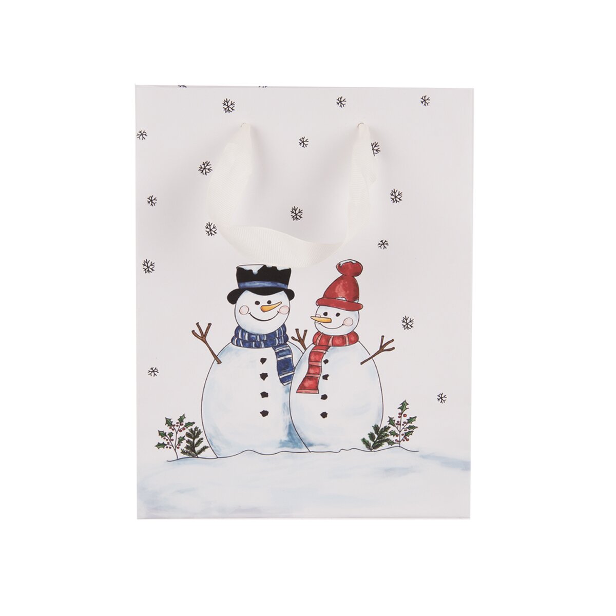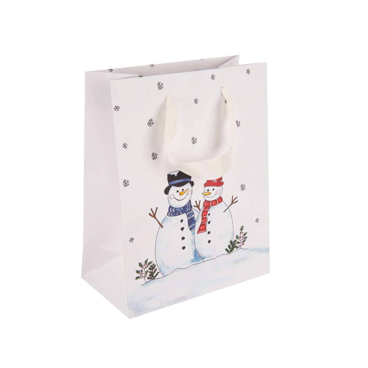 Kód produktu 822787Biela papierová taška s rozmermi 18x10x23 cm je zdobená originálnym dekorom snehuliaka a hodí sa na uloženie najrôznejších darčekov.