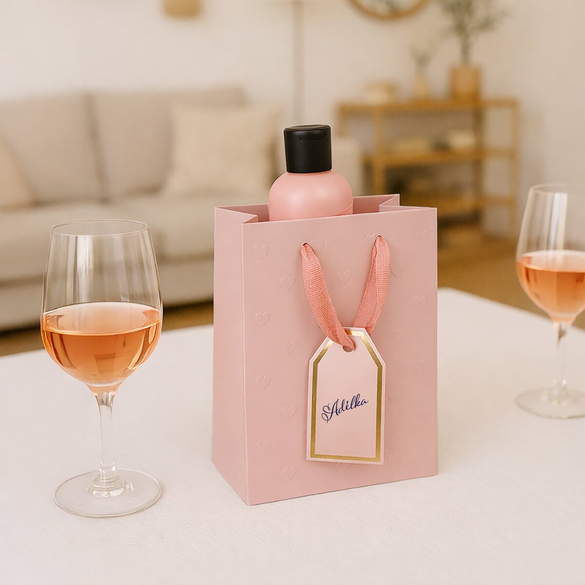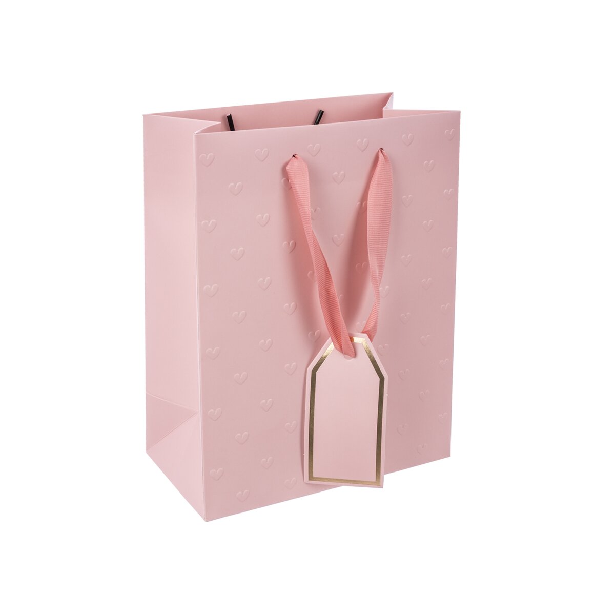 Kód produktu 823121Darčeková taška s dvoma ušami z ružovej stuhy, plastický dekor z oboch strán, doplnená menovkou. Ružová. Materiál: papier, stužka – polyester. Rozmery: 18x10x23 cm.