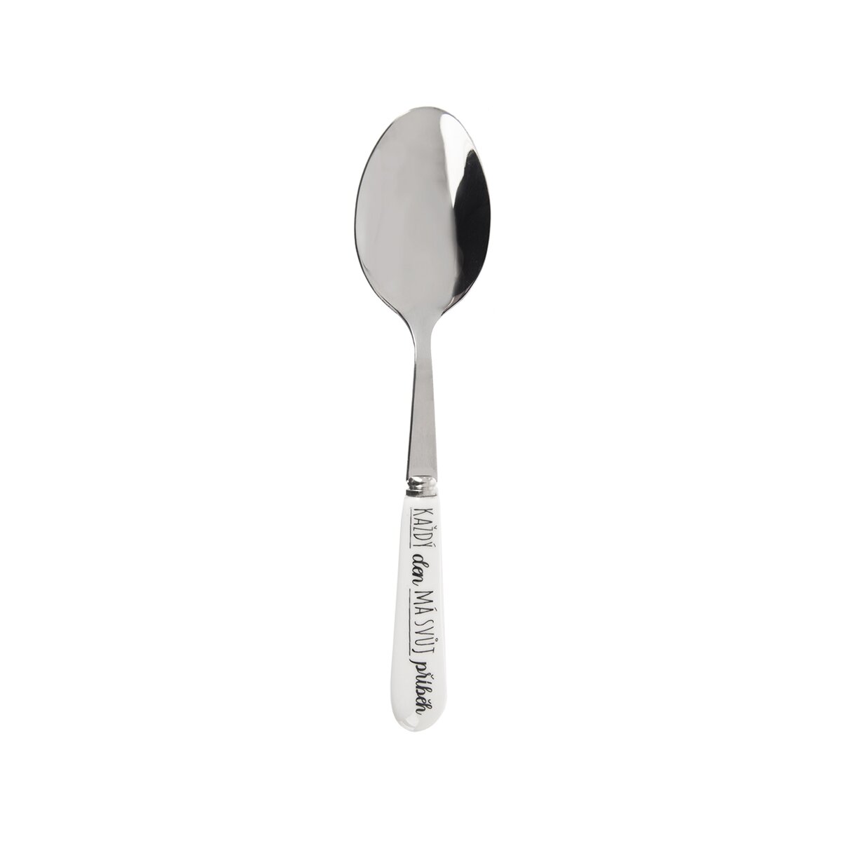 Originálna lyžička na podávanie čaju, kávy alebo nejakej sladkej dobroty poteší každého. Kovová lyžička s bielou keramickou rukoväťou, na ktorej je motivačný text "Každý den má svůj příběh", bude krásnym darčekom pre vašich blízkych.