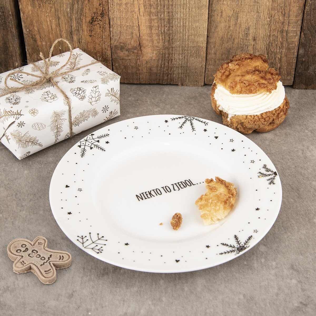 Zaslúžená chvíľka pokoja medzi vianočným zhonom môže byť aj v podobe sladkého múčnika, servírovaného na krásnom dezertnom tanieri. Je po obvode zdobený jemnými vločkami a uprostred, napríklad pod chlebíčkom, tortou alebo zákuskom nájdete vtipný nápis "NIEKTO TO ZJEDOL".