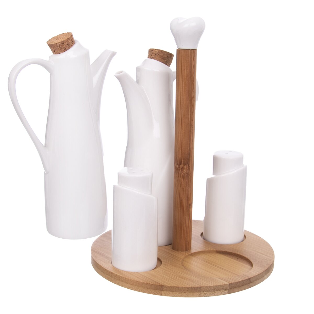 Súčasťou súpravy sú aj dve porcelánové kanvičky na olej a ocot, ktoré majú korkový uzáver a lieviky uľahčujúce ich nalievanie. Kvalitný materiál, elegantné tvary a nežná biela farba z nich vytvára krásne kúsky ladiace ku každej sade riadu. A aby ste ich mohli ľahšie preniesť, nájdete v súprave aj podnos z bambusového dreva.