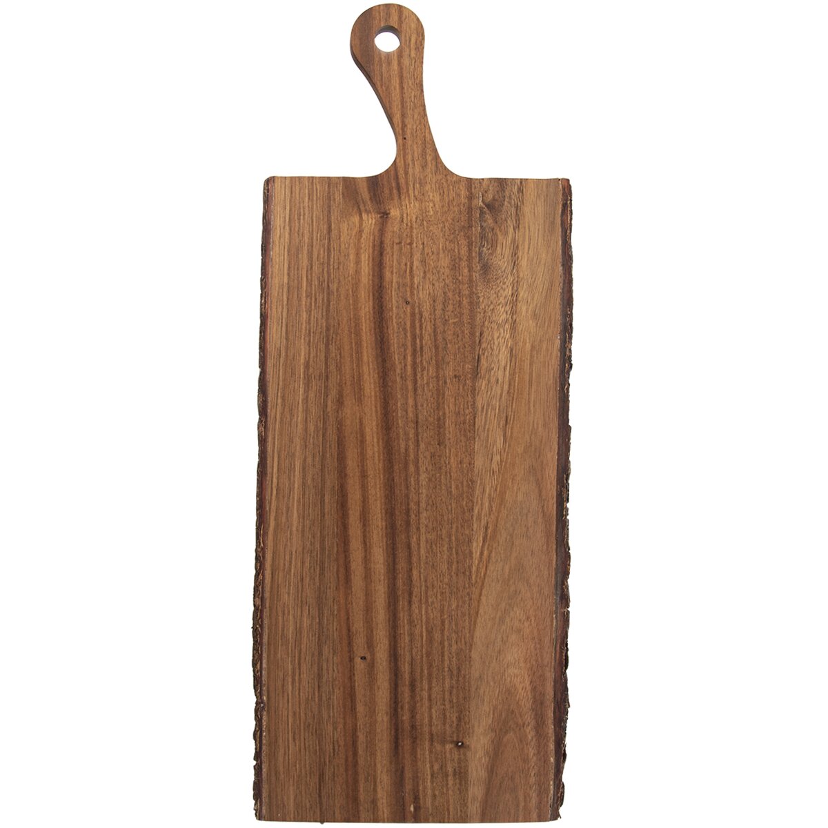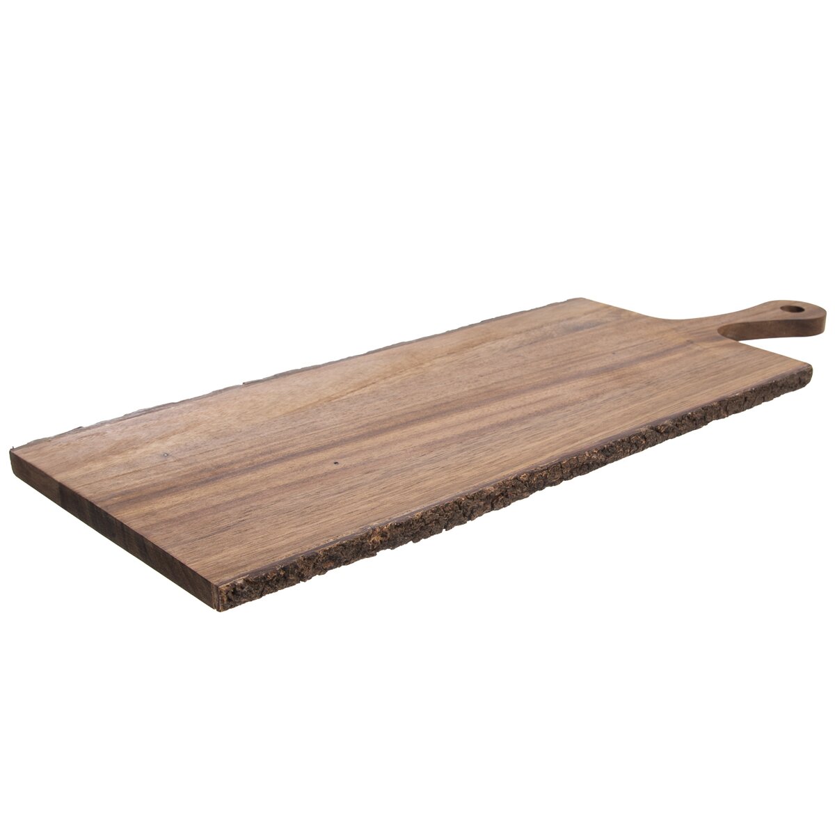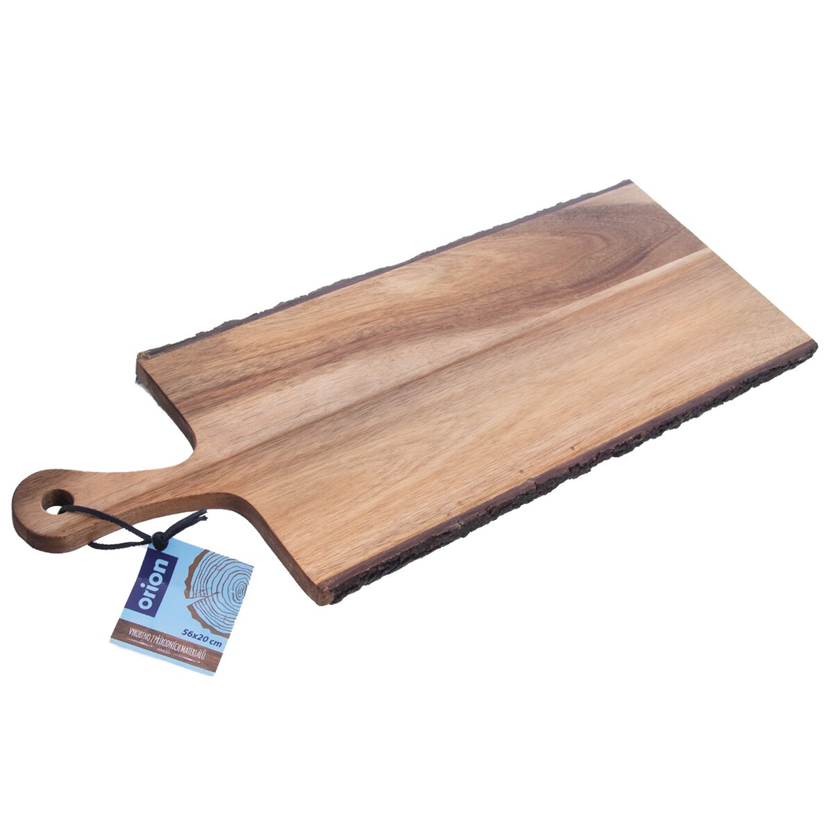 Kód produktu 126812Drevená doska z akácie v rozmere 56×20×1,5 cm s praktickou rukoväťou a kúrou po obvode. Hodí sa na krájanie aj servírovanie potravín.