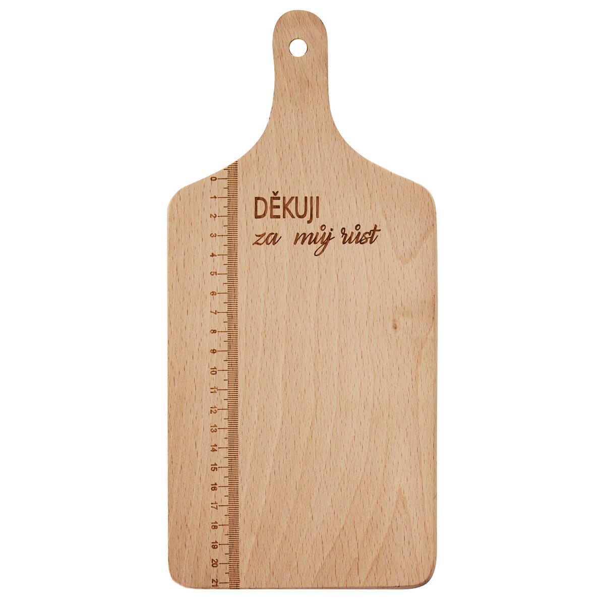 Kód produktu 126817Drevená doska na krájanie v rozmere 30×14 cm s praktickou rukoväťou a vypaľovaným nápisom „DĚKUJI za můj růst“.