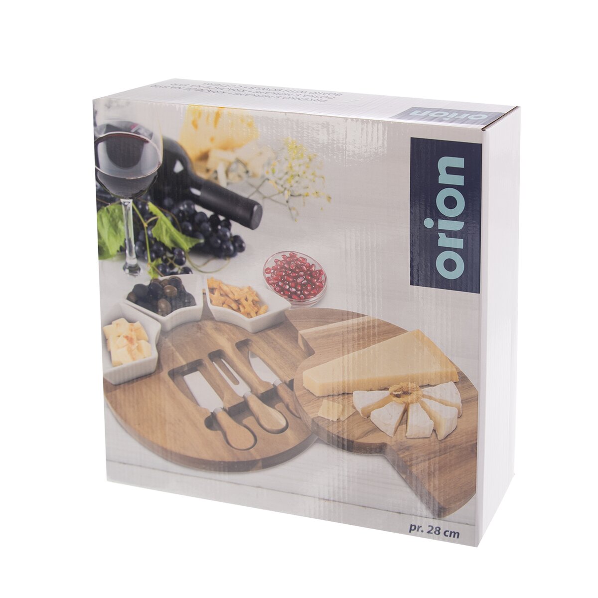 Kód produktu 126843Sada akáciovej dosky na krájanie s priemerom 28 cm ukrýva 3 krájače na syr s dĺžkou 13 cm a je doplnená 3 keramickými miskami na oriešky, olivy, dipy alebo rôzne drobné krekry.