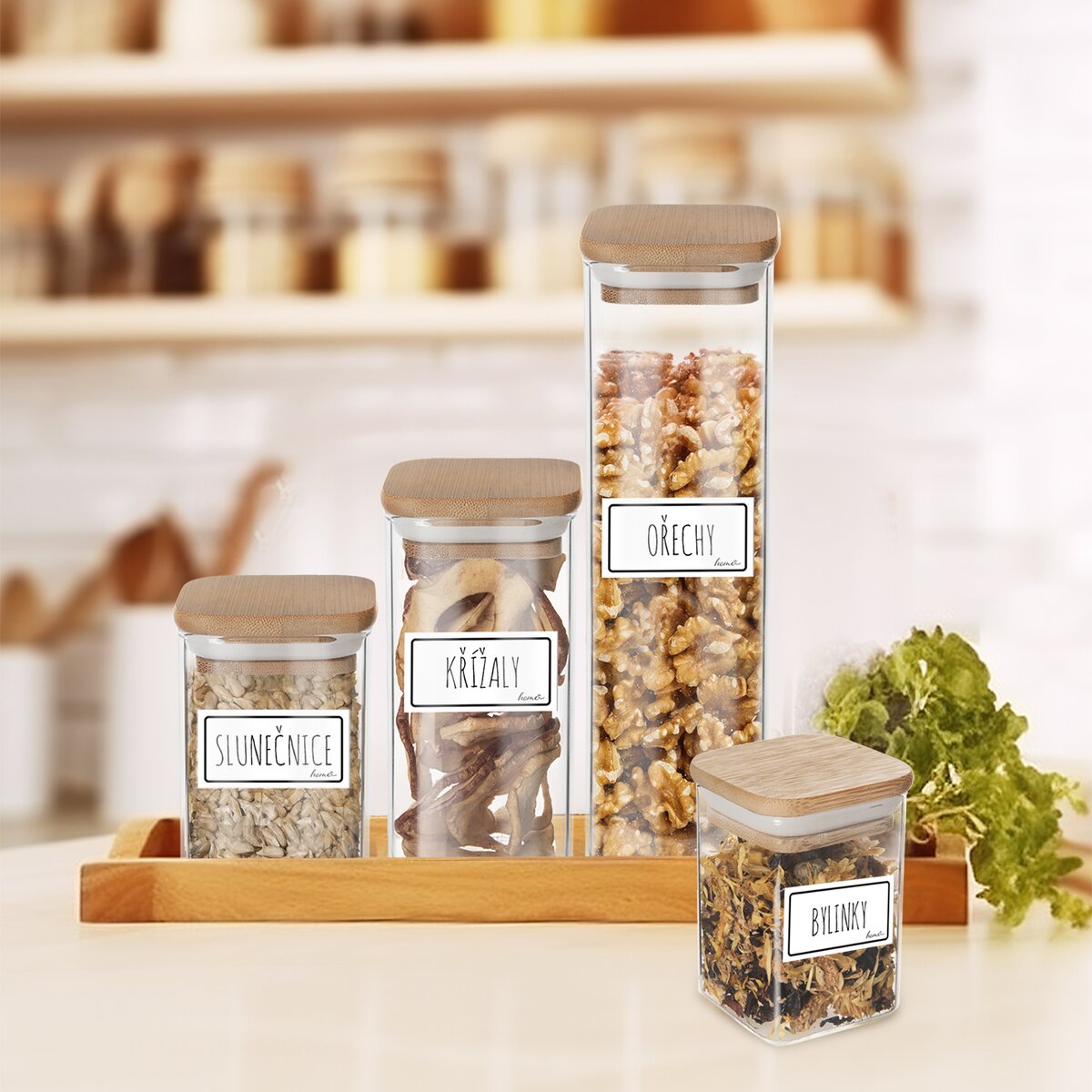Kód produktu 127583Hranatá dóza z borosilikátového skla má objem 0,37 l a je určená na uloženie rôznych surovín, korenia a dochucovadiel. Pevné uzavretie zaistí bambusové viečko so silikónovým tesnením.