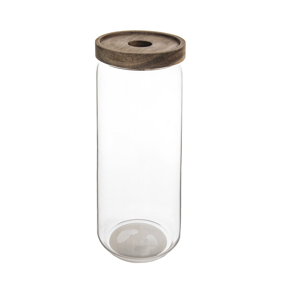 Kód produktu 127555Okrúhla sklenená dóza s objemom 1 l je vhodná na uskladnenie najrôznejších surovín na varenie a pečenie. Uzatvára sa viečkom z akáciového dreva, opatreného silikónovým tesnením.