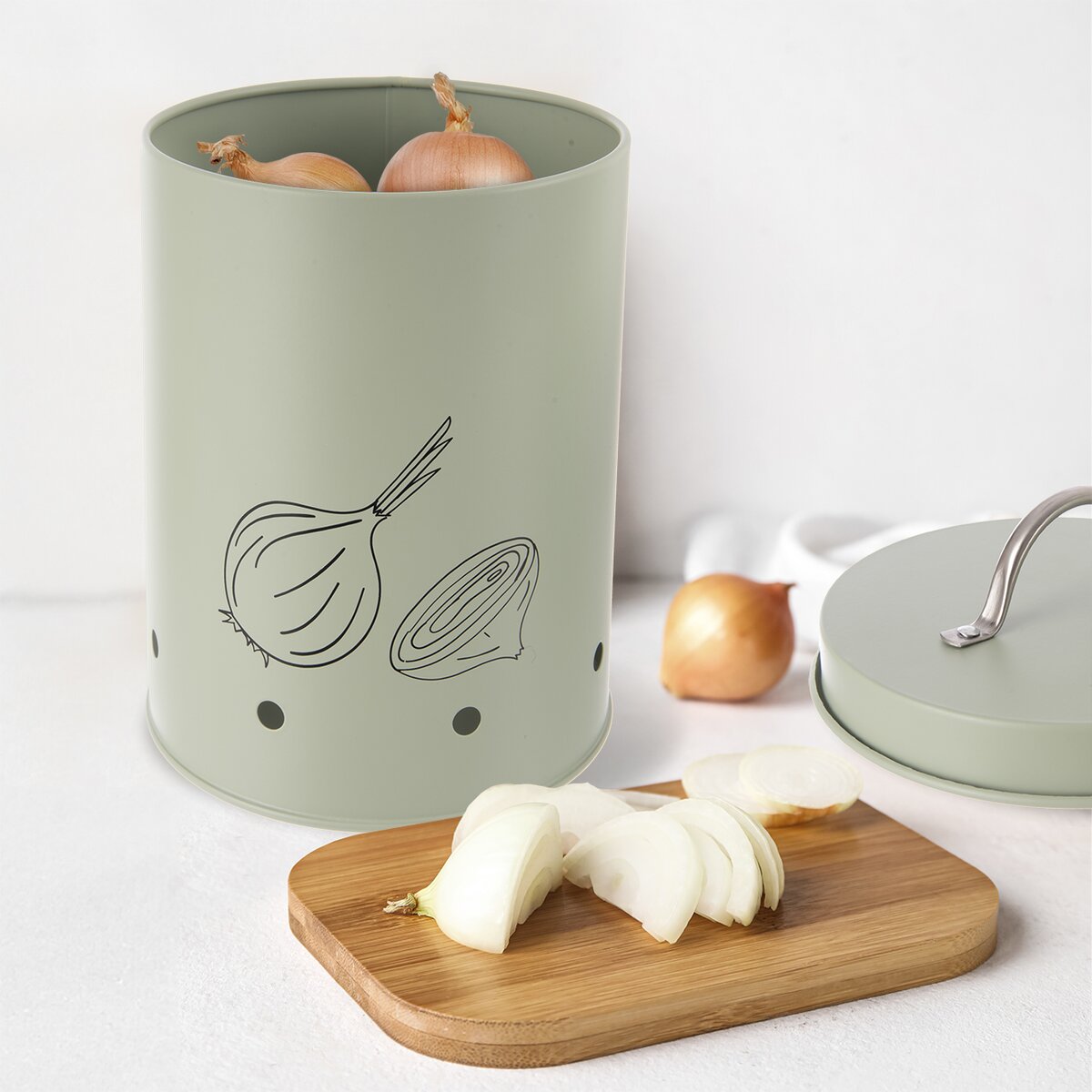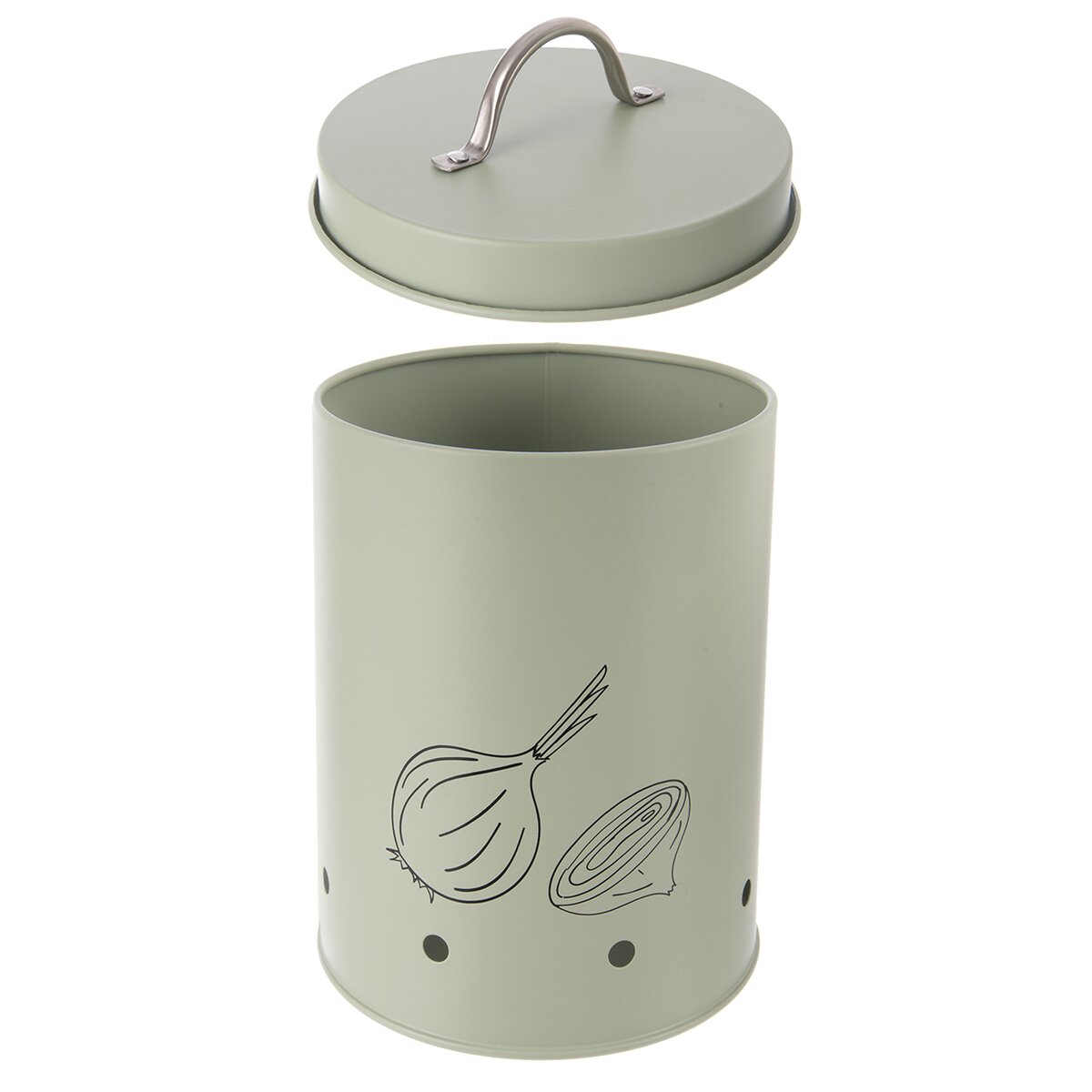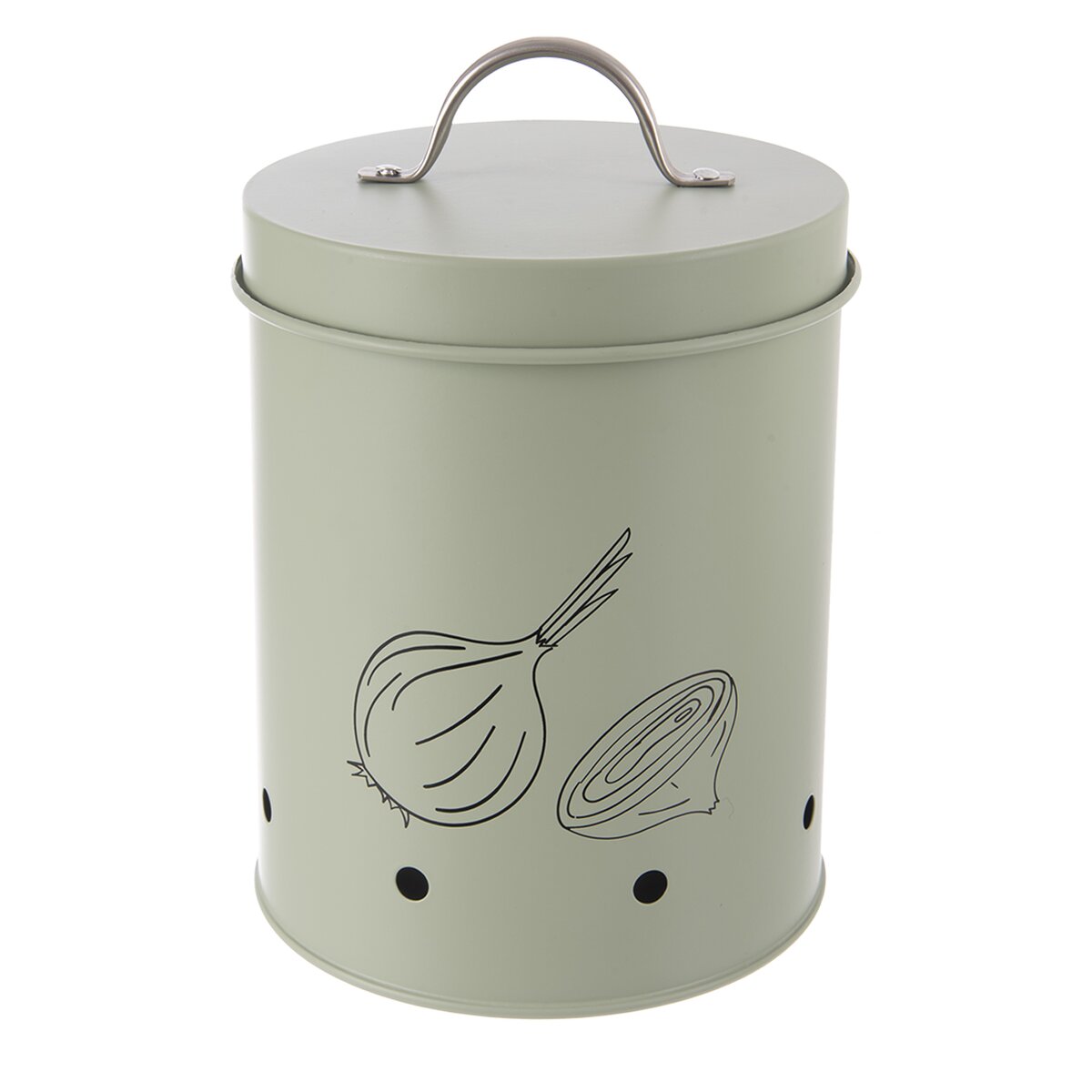 Potlač napovie, aký obsah dóza ukrýva. Táto štýlová dóza bude skvelým miestom na uloženie cibule na kuchynské použitie. Súčasťou je aj viečko s držadlom. Ventilačné otvory zaisťujú cirkuláciu vzduchu, zamedzujú hromadeniu vlhkosti a tepla a tým zabraňujú klíčeniu, vzniku plesní a zaisťujú dlhšiu trvanlivosť. Navyše je aj dizajnovým kúskom.