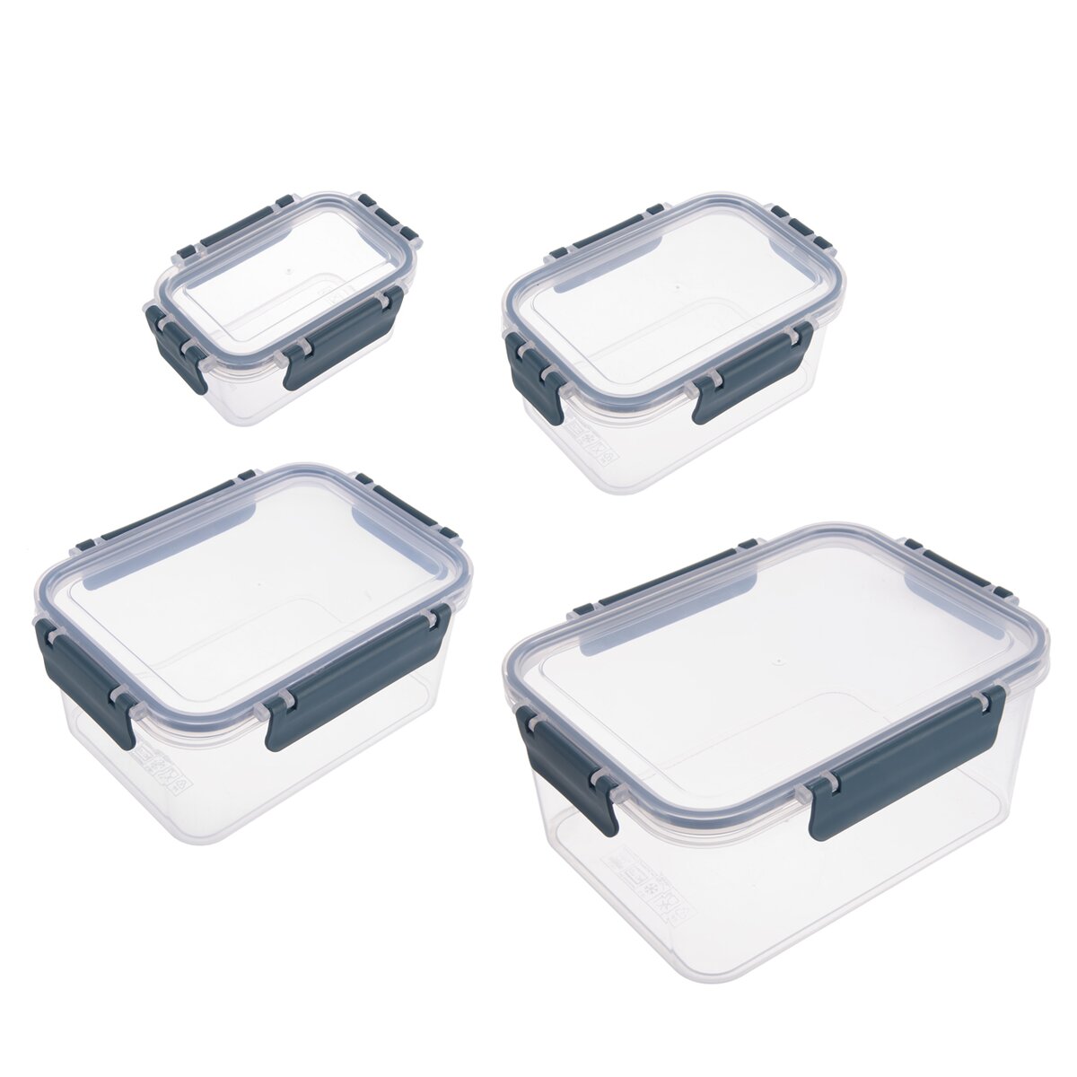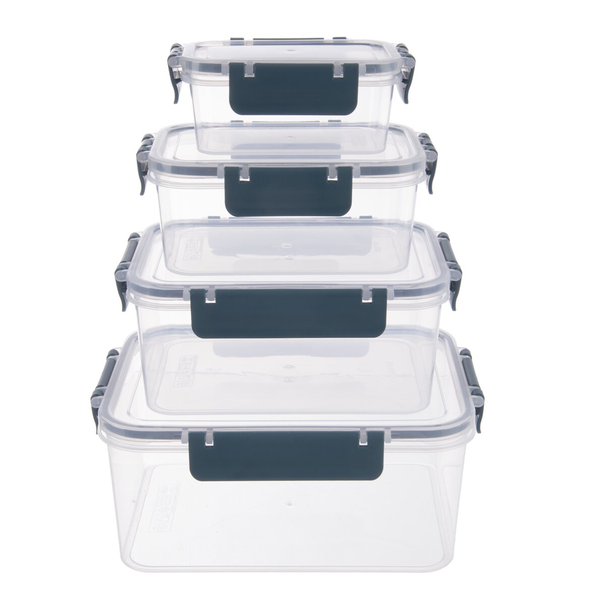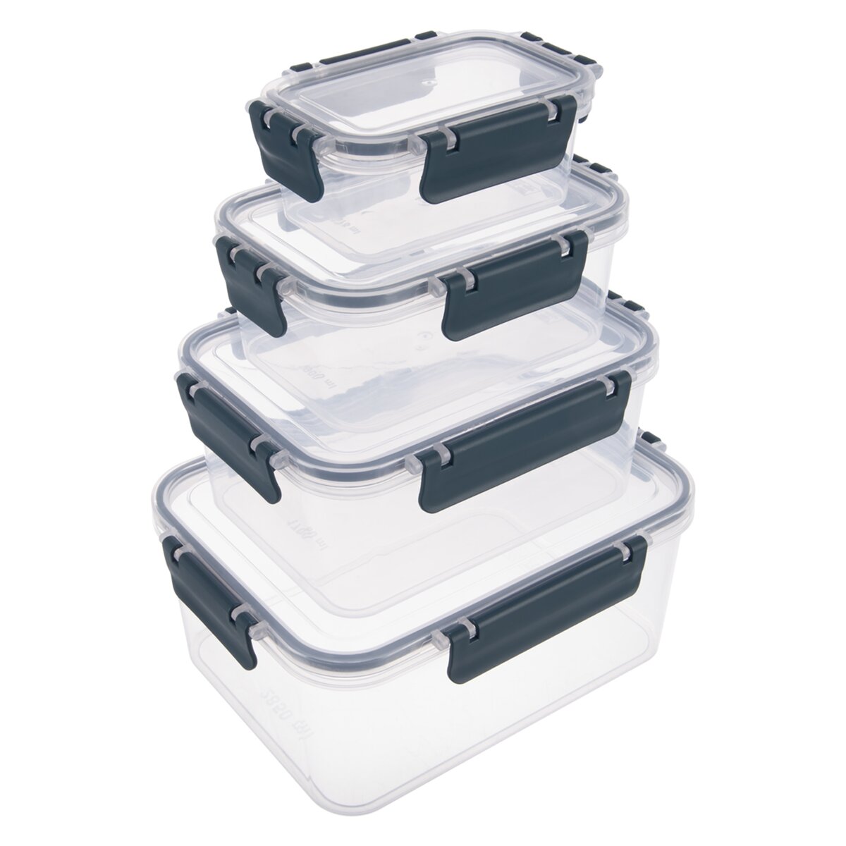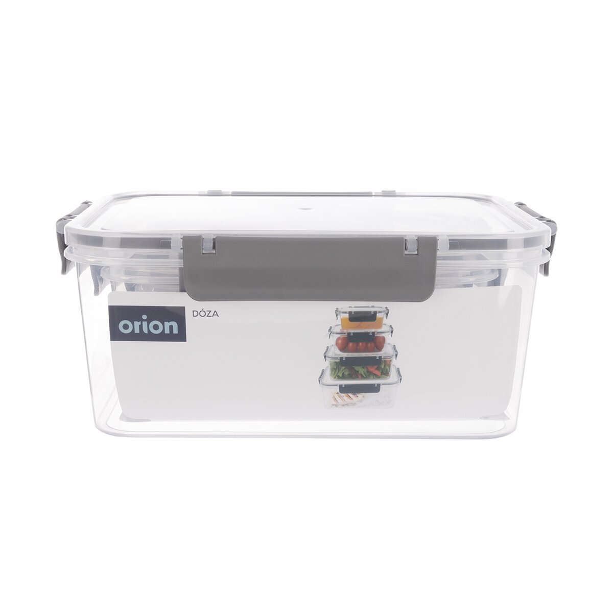 Kód produktu 154507Sada 4 transparentných obdĺžnikových dóz s viečkami na klipy a so silikónovým tesnením majú objem 0,375 l, 0,9 l, 1,7 l a 2,85 l. Hodí sa na uloženie surovín na varenie a pečenie, na prevážanie hotových jedál do práce, na výlety, na uložený drobností v domácnosti.